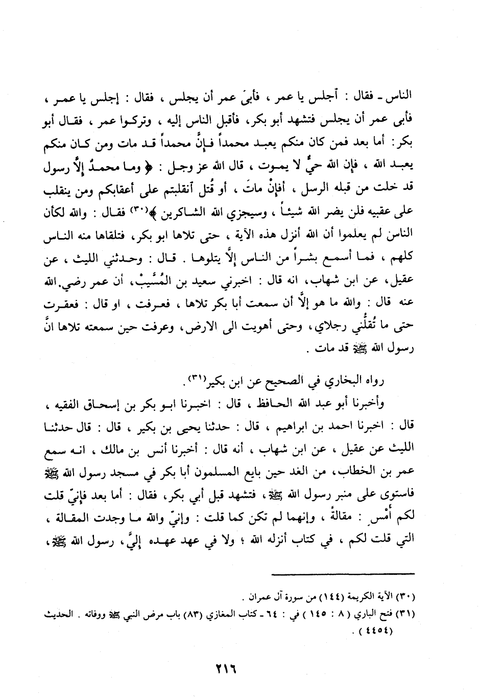 النَّاسَ- فَقَالَ: اجْلِسْ يَا عُمَرُ، فَأَبَى عُمَرُ أَنْ يَجْلِسَ، فَقَالَ: اجْلِسْ يَا عُمَرُ، فَأَبَى عُمَرُ أَنْ يَجْلِسَ فَتَشَهَّدَ أَبُو بَكْرٍ، فَأَقْبَلَ النَّاسُ إِلَيْهِ، وَتَرَكُوا عُمَرَ، فَقَالَ أَبُو بَكْرٍ: أَمَّا بَعْدُ فَمَنْ كَانَ مِنْكُمْ يَعْبُدُ مُحَمَّدًا فَإِنَّ مُحَمَّدًا قَدْ مَاتَ وَمَنْ كَانَ مِنْكُمْ يَعْبُدُ اللهَ، فَإِنَّ اللهَ حَيٌّ لَا يَمُوتُ، قَالَ اللهُ عَزَّ وَجَلَّ: وَما مُحَمَّدٌ إِلَّا رَسُولٌ قَدْ خَلَتْ مِنْ قَبْلِهِ الرُّسُلُ، أَفَإِنْ ماتَ، أَوْ قُتِلَ انْقَلَبْتُمْ عَلى أَعْقابِكُمْ وَمَنْ يَنْقَلِبْ عَلى عَقِبَيْهِ فَلَنْ يَضُرَّ اللَّهَ شَيْئاً، وَسَيَجْزِي اللَّهُ الشَّاكِرِينَ [ (30) ] فَقَالَ: وَاللهِ لَكَأَنَّ النَّاسَ لم يعلمون أَنَّ اللهَ أَنْزَلَ هَذِهِ الْآيَةَ، حَتَّى تَلَاهَا أَبُو بَكْرٍ، فَتَلَقَّاهَا مِنْهُ النَّاسُ كُلُّهُمْ، فَمَا أَسْمَعُ بَشَرًا مِنَ النَّاسِ إِلَّا يَتْلُوهَا. قَالَ: وحَدَّثَنِي اللَّيْثُ، عَنْ عُقَيْلٍ، عَنِ ابْنِ شِهَابٍ، أَنَّهُ قَالَ: أَخْبَرَنِي سَعِيدُ بْنُ الْمُسَيِّبِ، أَنَّ عُمَرَ رَضِيَ اللهُ عَنْهُ قَالَ: وَاللهِ مَا هُوَ إِلَّا أَنْ سَمِعْتُ أَبَا بَكْرٍ تَلَاهَا، فَعَرَفْتُ، أَوْ قَالَ: فَعَقِرْتُ حَتَّى مَا تُقِلُّنِي رِجْلَايَ، وَحَتَّى أَهْوَيْتُ إِلَى الْأَرْضِ، وَعَرَفْتُ حِينَ سَمِعْتُهُ تَلَاهَا أَنَّ رَسُولَ اللهِ صَلَّى الله عليه وسلم قَدْ مَاتَ.