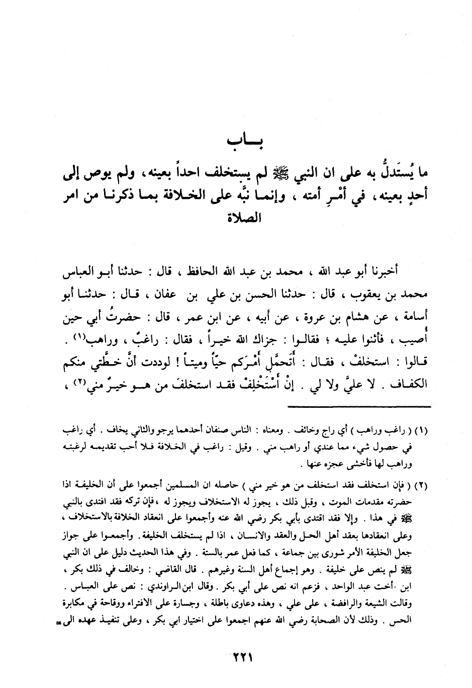 بَابُ مَا يُسْتَدَلُّ بِهِ عَلَى أَنَّ النَّبِيَّ صَلَّى اللهُ عَلَيْهِ وَسَلَّمَ لَمْ يَسْتَخْلِفْ أَحَدًا بِعَيْنِهِ، وَلَمْ يُوصِ إِلَى أَحَدٍ بِعَيْنِهِ، فِي أَمْرِ أُمَّتِهِ، وَإِنَّمَا نَبَّهَ عَلَى الْخِلَافَةِ بِمَا ذَكَرْنَا مِنْ أَمْرِ الصَّلَاةِ