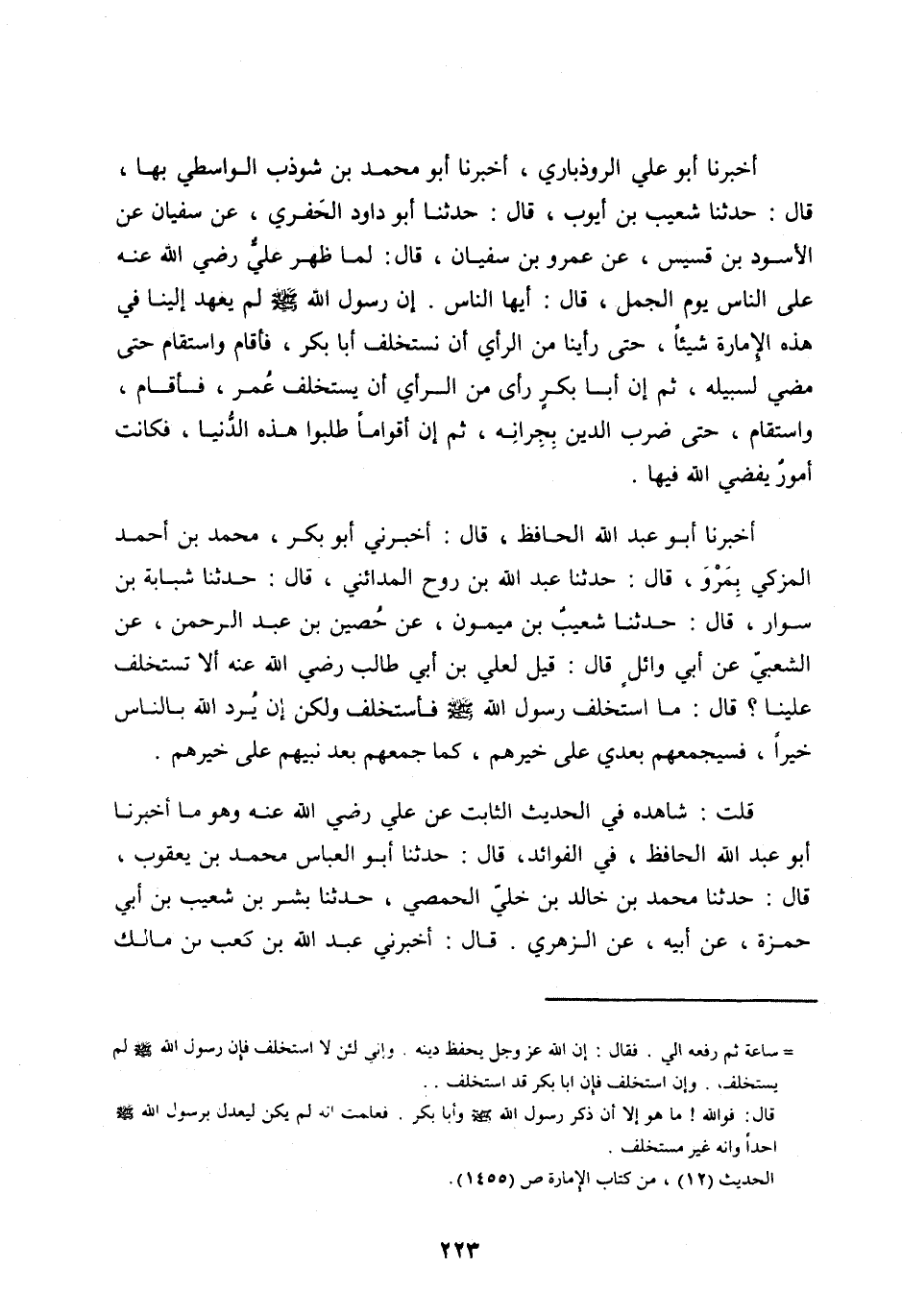 أَخْبَرَنَا أَبُو عَلِيٍّ الرُّوذْبَارِيُّ، أَخْبَرَنَا أَبُو مُحَمَّدِ بْنُ شَوْذَبٍ الْوَاسِطِيُّ بِهَا، قَالَ: حَدَّثَنَا شُعَيْبُ بْنُ أَيُّوبَ، قَالَ: حَدَّثَنَا أَبُو دَاوُدَ الْحَفْرِيُّ، عَنْ سُفْيَانَ عَنِ الأسود بن قسيس، عَنْ عَمْرِو بْنِ سُفْيَانَ، قَالَ: لَمَّا ظَهَرَ عَلِيٌّ رَضِيَ اللهُ عَنْهُ عَلَى النَّاسِ يَوْمَ الْجَمَلِ، قَالَ: أَيُّهَا النَّاسُ. إِنَّ رَسُولَ اللهِ صلى الله عليه وَسَلَّمَ لَمْ يَعْهَدْ إِلَيْنَا فِي هَذِهِ الْإِمَارَةِ شَيْئًا، حَتَّى رَأَيْنَا مِنَ الرَّأْيِ أَنْ نَسْتَخْلِفَ أَبَا بَكْرٍ، فَأَقَامَ وَاسْتَقَامَ حَتَّى مَضَى لِسَبِيلِهِ، ثُمَّ إِنَّ أَبَا بَكْرٍ رَأَى مِنَ الرَّأْيِ أَنْ يَسْتَخْلِفَ عُمَرَ، فَأَقَامَ، وَاسْتَقَامَ، حَتَّى ضَرَبَ الدِّينَ بِجِرَانِهِ، ثُمْ إِنَّ أَقْوَامًا طَلَبُوا هَذِهِ الدُّنْيَا، فَكَانَتْ أمور يفضي اللهُ فِيهَا.