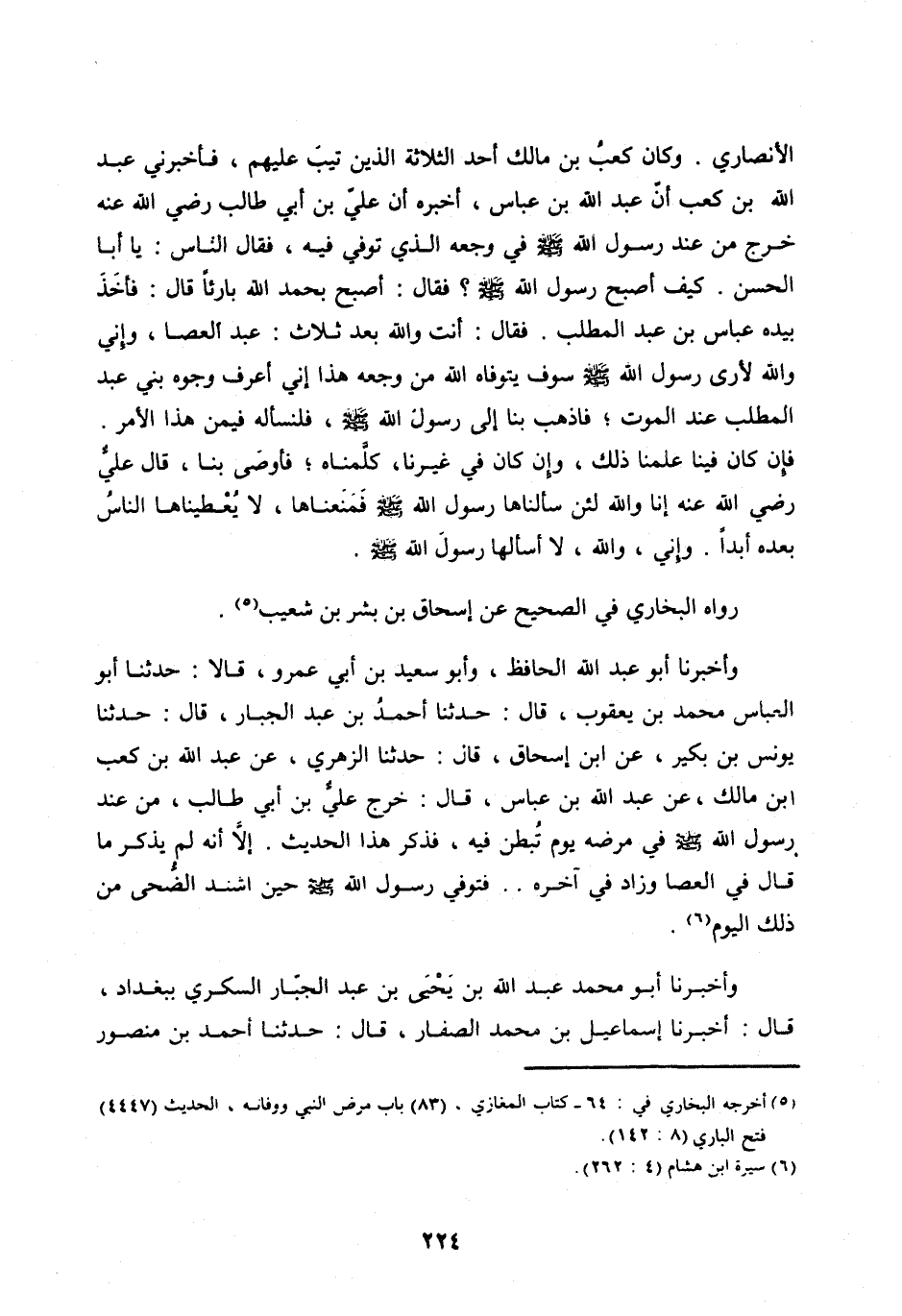 الْأَنْصَارِيُّ. وَكَانَ كَعْبُ بْنُ مَالِكٍ أَحَدَ الثَّلَاثَةِ الَّذِينَ تِيبَ عَلَيْهِمْ، فَأَخْبَرَنِي عَبْدُ اللهِ بْنُ كَعْبٍ أَنَّ عَبْدَ اللهِ بْنَ عَبَّاسٍ، أَخْبَرَهُ أَنَّ عَلِيَّ بْنَ أَبِي طَالِبٍ رَضِيَ اللهُ عَنْهُ خَرَجَ مِنْ عِنْدِ رَسُولِ اللهِ صَلَّى اللهُ عَلَيْهِ وَسَلَّمَ فِي وَجَعِهِ الَّذِي تُوُفِّيَ فِيهِ، فَقَالَ النَّاسُ: يَا أَبَا الْحَسَنِ. كَيْفَ أَصْبَحَ رَسُولُ اللهِ صَلَّى اللهُ عَلَيْهِ وَسَلَّمَ؟ فَقَالَ: أَصْبَحَ بِحَمْدِ اللهِ بَارِئًا قَالَ: فَأَخَذَ بِيَدِهِ عَبَّاسُ بْنُ عَبْدِ الْمُطَّلِبِ. فَقَالَ: أَنْتَ وَاللهِ بَعْدَ ثَلَاثٍ: عَبْدُ الْعَصَا، وَإِنِّي وَاللهِ لَأَرَى رَسُولَ اللهِ صلى الله عليه وسلم سَوْفَ يَتَوَفَّاهُ اللهُ مِنْ وَجَعِهِ هَذَا إِنِّي أَعْرِفُ وُجُوهَ بَنِي عَبْدِ الْمُطَّلِبِ عِنْدَ الْمَوْتِ، فَاذْهَبْ بِنَا إِلَى رَسُولِ اللهِ صَلَّى اللهُ عَلَيْهِ وَسَلَّمَ، فَلْنَسْأَلْهُ فِيمَنْ هَذَا الْأَمْرُ.