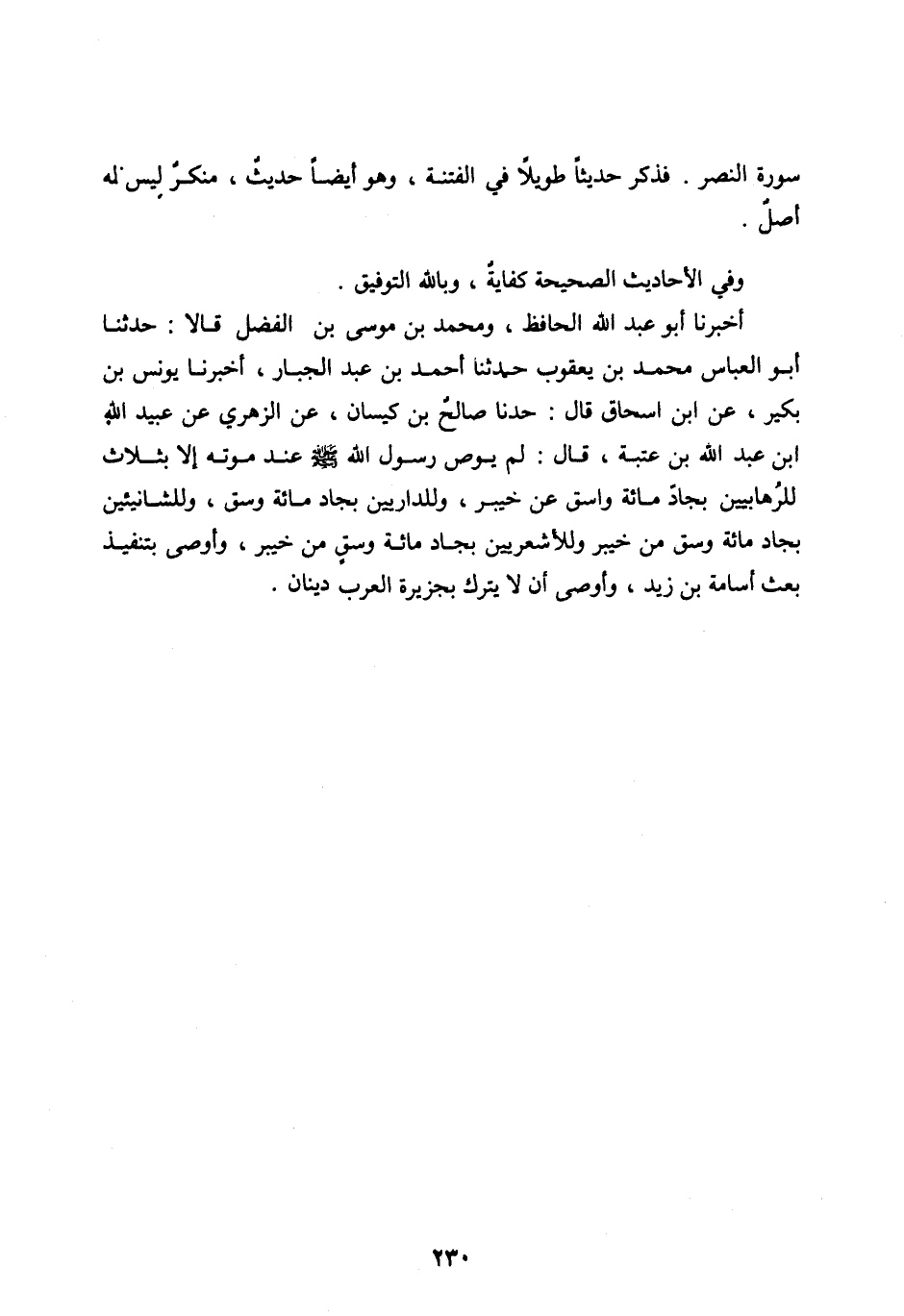 أَخْبَرَنَا أَبُو عَبْدِ اللهِ الْحَافِظُ، ومُحَمَّدُ بْنُ مُوسَى، بْنِ الْفَضْلِ قَالَا: حَدَّثَنَا أَبُو الْعَبَّاسِ مُحَمَّدُ بْنُ يَعْقُوبَ حَدَّثَنَا أَحْمَدُ بْنُ عَبْدِ الْجَبَّارِ، أَخْبَرَنَا يُونُسُ بْنُ بُكَيْرٍ، عَنِ ابْنِ إِسْحَاقَ قَالَ: حدنا صَالِحُ بْنُ كَيْسَانَ، عَنِ الزُّهْرِيِّ عَنْ عُبَيْدِ اللهِ ابْنَ عَبْدِ اللهِ بْنِ عُتْبَةَ، قَالَ: لَمْ يُوصِ رسول الله صلى الله عَلَيْهِ وَسَلَّمَ عِنْدَ مَوْتِهِ إلا بثلاث للرهابيين بجادّ مائة واسق عَنْ خَيْبَرَ، وَلِلدَّارِيِّينَ بِجَادِّ مائة وسق، وللشانيئين بِجَادِّ مِائَةِ وَسْقٍ مِنْ خَيْبَرَ وَلِلْأَشْعَرِيِّينَ بِجَادِّ مِائَةِ وَسْقٍ مِنْ خَيْبَرَ، وَأَوْصَى بِتَنْفِيذِ بَعْثِ أُسَامَةَ بْنِ زَيْدٍ، وَأَوْصَى أَنْ لَا يُتْرَكَ بِجَزِيرَةِ الْعَرَبِ دِينَانِ.