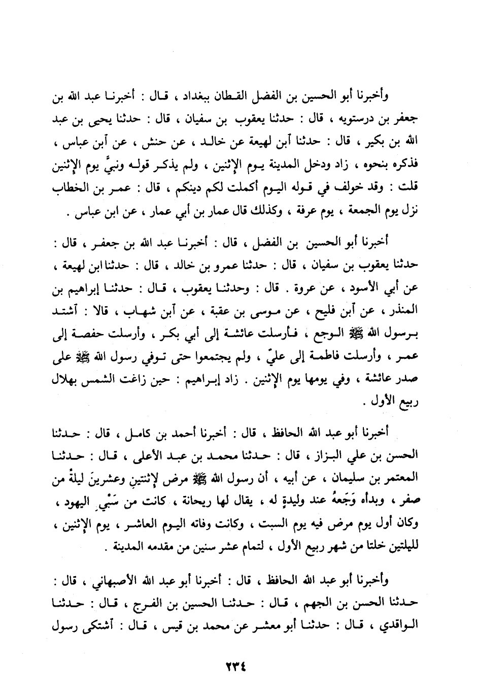 حَدَّثَنَا يَعْقُوبُ بْنُ سُفْيَانَ، قَالَ: حَدَّثَنَا عَمْرُو بْنُ خَالِدٍ، قال: حدثنا بن لَهِيعَةَ، عَنْ أَبِي الْأَسْوَدِ، عَنْ عُرْوَةَ. قَالَ: وَحَدَّثَنَا يَعْقُوبُ، قَالَ: حَدَّثَنَا إِبْرَاهِيمُ بْنُ الْمُنْذِرِ، عَنِ ابْنِ فُلَيْحٍ، عَنْ مُوسَى بْنِ عُقْبَةَ، عَنِ ابْنِ شِهَابٍ، قَالَا: اشْتَدَّ بِرَسُولِ اللهِ صَلَّى اللهُ عليه وسلم الْوَجَعُ، فَأَرْسَلَتْ عَائِشَةُ إِلَى أَبِي بَكْرٍ، وَأَرْسَلَتْ حَفْصَةُ إِلَى عُمَرَ، وَأَرْسَلَتْ فَاطِمَةُ إِلَى عَلِيٍّ، وَلَمْ يَجْتَمِعُوا حَتَّى تُوُفِّيَ رَسُولُ اللهِ صَلَّى اللهُ عَلَيْهِ وسلم عَلَى صَدْرِ عَائِشَةَ، وَفِي يَوْمِهَا يَوْمِ الْإِثْنَيْنِ. زَادَ إِبْرَاهِيمُ: حِينَ زَاغَتِ الشَّمْسُ بِهِلَالِ رَبِيعٍ الْأَوَّلَ.