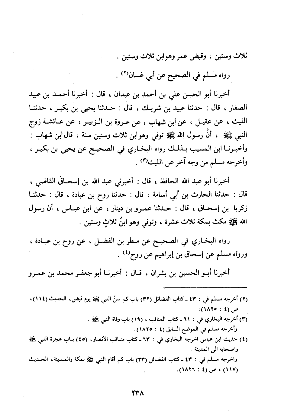 [ (2) ] أخرجه مسلم فِي: 43- كِتَابِ الْفَضَائِلِ (32) بَابُ كم سنّ النبي صلى الله عليه وسلم يوم قبض، الحديث (114) ، ص (4: 1825) .