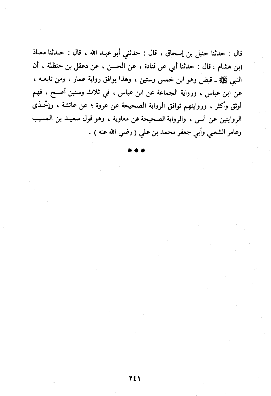 قَالَ: حَدَّثَنَا حَنْبَلُ بْنُ إِسْحَاقَ، قَالَ: حَدَّثَنِي أَبُو عبد الله، قال: حدثنا معاذ ابن هِشَامٍ، قَالَ: حَدَّثَنَا أَبِي عَنْ قَتَادَةَ، عَنِ الْحَسَنِ، عن دعقل بْنِ حَنْظَلَةَ، أَنَّ النَّبِيَّ صَلَّى اللهُ عَلَيْهِ وسلم- قُبِضَ وَهُوَ ابْنُ خَمْسٍ وَسِتِّينَ، وَهَذَا يُوَافِقُ رِوَايَةَ عَمَّارٍ، وَمَنْ تَابَعَهُ، عَنِ ابْنِ عَبَّاسٍ، وَرِوَايَةُ الْجَمَاعَةِ عَنِ ابْنِ عَبَّاسٍ، فِي ثَلَاثٍ وَسِتِّينَ أَصَحُّ، فَهُمْ أَوْثَقُ وَأَكْثَرُ، وَرِوَايَتُهُمْ تُوَافِقُ الرِّوَايَةَ الصَّحِيحَةَ عَنْ عُرْوَةَ، عَنْ عَائِشَةَ، وَإِحْدَى الرِّوَايَتَيْنِ عَنْ أَنَسٍ، وَالرِّوَايَةُ الصَّحِيحَةُ عَنْ مُعَاوِيَةَ، وَهُوَ قَوْلُ سَعِيدِ بْنِ الْمُسَيِّبِ وَعَامِرٍ الشَّعْبِيِّ وَأَبِي جَعْفَرٍ مُحَمَّدِ بْنِ عَلِيٍّ (رَضِيَ اللهُ عَنْهُ) .