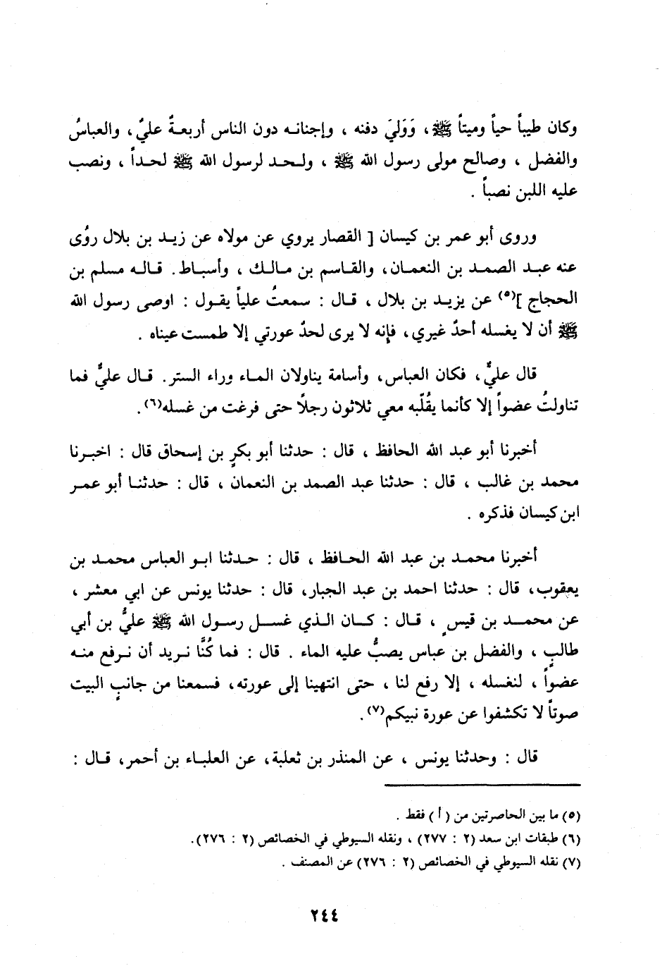 أَخْبَرَنَا مُحَمَّدُ بْنُ عَبْدِ اللهِ الْحَافِظُ، قَالَ: حَدَّثَنَا أَبُو الْعَبَّاسِ مُحَمَّدُ بْنُ يَعْقُوبَ، قَالَ: حَدَّثَنَا أَحْمَدُ بْنُ عَبْدِ الْجَبَّارِ، قَالَ: حَدَّثَنَا يُونُسُ عَنْ أَبِي مَعْشَرٍ، عَنْ مُحَمَّدِ بْنِ قَيْسٍ، قَالَ: كَانَ الَّذِي غَسَّلَ رَسُولُ اللهِ صَلَّى الله عليه وَسَلَّمَ عَلِيُّ بْنُ أَبِي طَالِبٍ، وَالْفَضْلُ بْنُ عَبَّاسٍ يَصُبُّ عَلَيْهِ الْمَاءَ. قَالَ: فَمَا كُنَّا نُرِيدُ أَنْ نَرْفَعَ مِنْهُ عُضْوًا، لِنَغْسِلَهُ، إِلَّا رُفِعَ لَنَا، حَتَّى انْتَهَيْنَا إِلَى عَوْرَتِهِ، فَسَمِعْنَا مِنْ جَانِبِ الْبَيْتِ صَوْتًا لَا تَكْشِفُوا عَنْ عَوْرَةِ نَبِيِّكُمْ [ (7) ] .