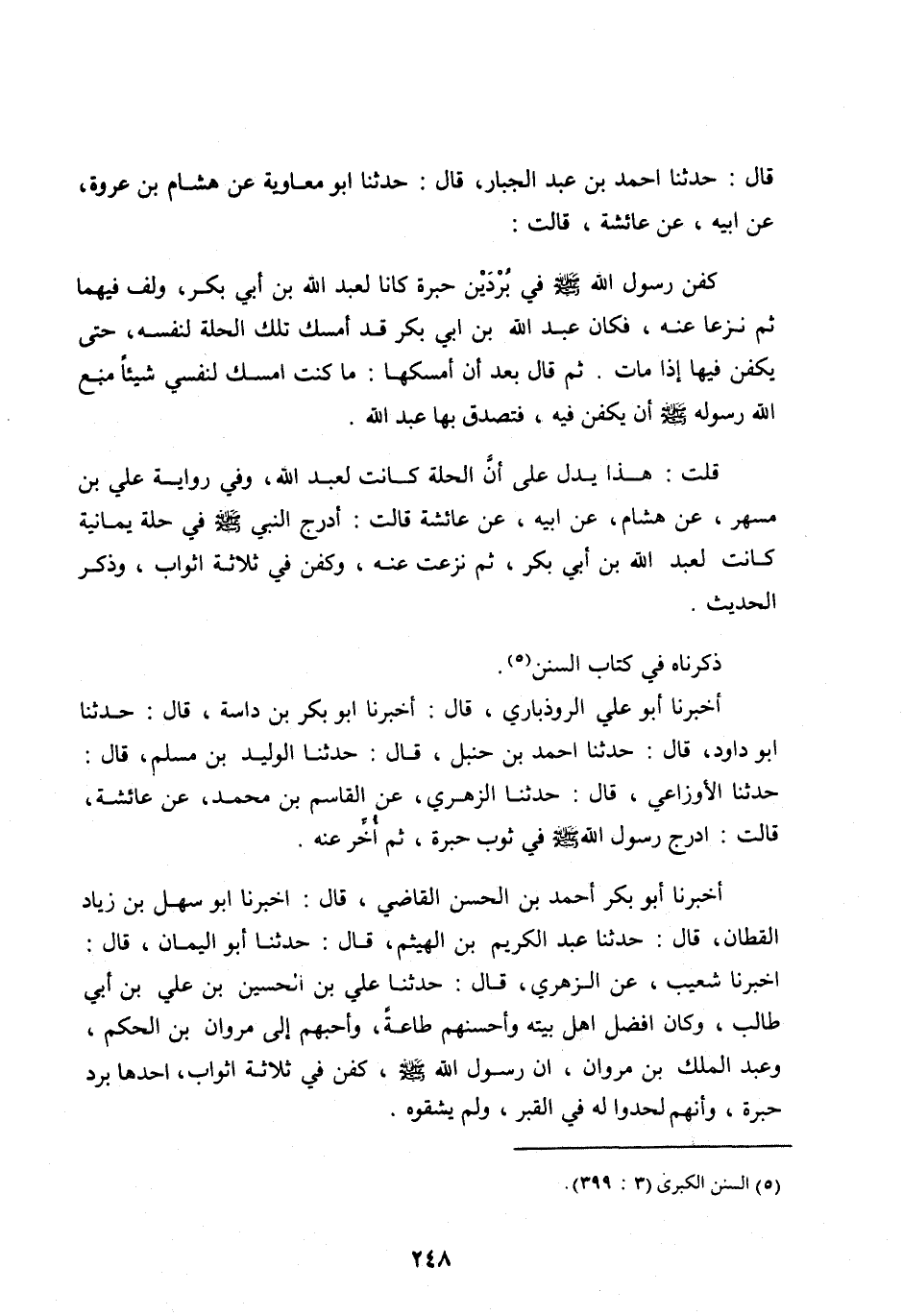 كُفِّنَ رَسُولُ اللهِ صَلَّى اللهُ عَلَيْهِ وَسَلَّمَ فِي بُرْدَيْنِ حِبَرَةٍ كَانَا لِعَبْدِ اللهِ بْنِ أُبَيٍّ بَكْرٍ، وَلُفَّ فِيهِمَا ثُمَّ نُزِعَا عَنْهُ، فَكَانَ عَبْدُ اللهِ بْنُ أَبِي بَكْرٍ قَدْ أَمْسَكَ تِلْكَ الْحُلَّةَ لِنَفْسِهِ، حَتَّى يُكَفَّنَ فِيهَا إِذَا مَاتَ. ثُمَّ قَالَ بَعْدَ أَنْ أَمْسَكَهَا: مَا كُنْتُ أُمْسِكُ لِنَفْسِي شَيْئًا مَنَعَ اللهُ رَسُولَهُ صَلَّى اللهُ عليه وَسَلَّمَ أَنْ يُكَفَّنَ فِيهِ، فَتَصَدَّقَ بِهَا عَبْدُ اللهِ.