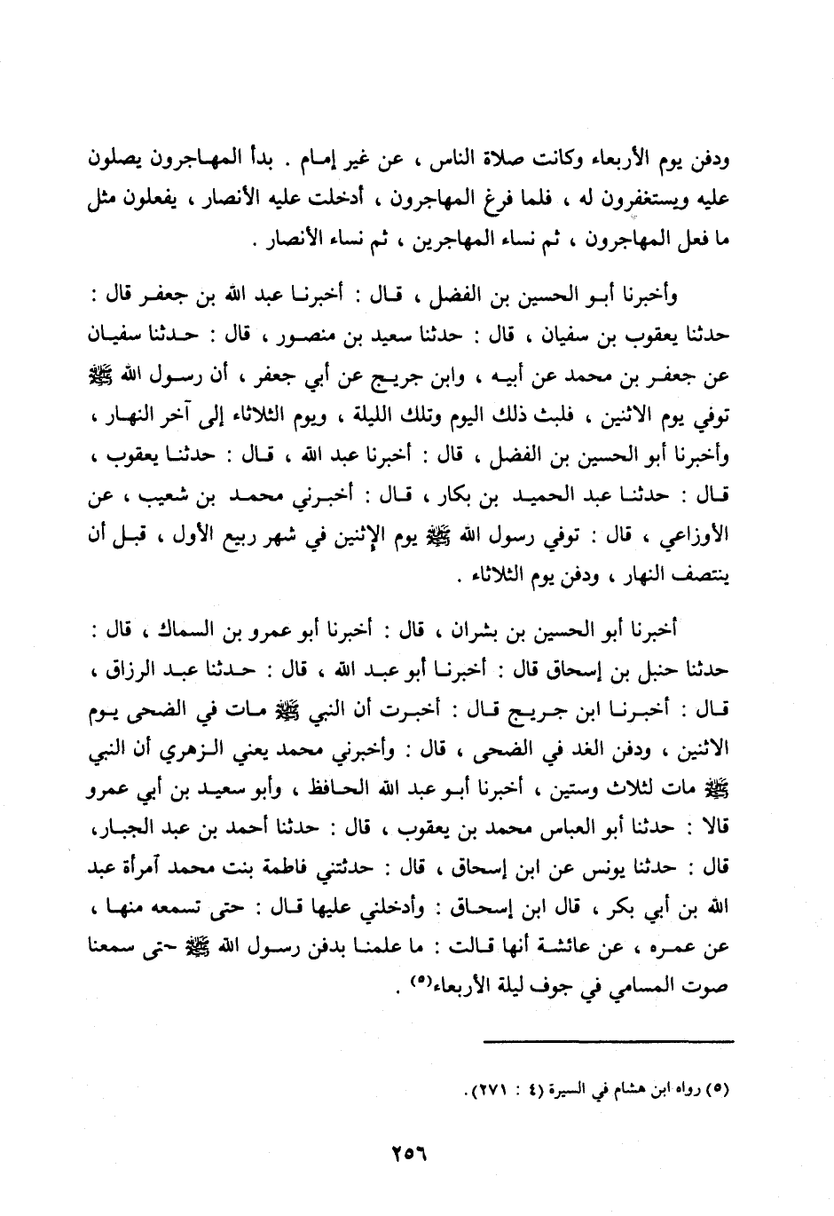 حَدَّثَنَا يَعْقُوبُ بْنُ سُفْيَانَ، قَالَ: حَدَّثَنَا سَعِيدُ بْنُ مَنْصُورٍ، قَالَ: حَدَّثَنَا سُفْيَانُ عَنْ جَعْفَرِ بْنِ مُحَمَّدٍ عَنْ أَبِيهِ، وَابْنُ جُرَيْجٍ عَنْ أَبِي جَعْفَرُ، إِنَّ رَسُولَ اللهِ صَلَّى اللهُ عَلَيْهِ وَسَلَّمَ تُوُفِّيَ يَوْمَ الِاثْنَيْنِ، فَلَبِثَ ذَلِكَ الْيَوْمَ وَتِلْكَ اللَّيْلَةَ، وَيَوْمَ الثُّلَاثَاءِ إِلَى آخِرِ النَّهَارِ، وأَخْبَرَنَا أَبُو الْحُسَيْنِ بْنُ الْفَضْلِ، قَالَ: أَخْبَرَنَا عَبْدُ اللهِ، قَالَ: حَدَّثَنَا يَعْقُوبُ، قَالَ: حَدَّثَنَا عَبْدُ الْحَمِيدِ بْنُ بَكَّارٍ، قَالَ: أَخْبَرَنِي مُحَمَّدُ بْنُ شُعَيْبٍ، عَنِ الْأَوْزَاعِيِّ، قَالَ: تُوُفِّيَ رَسُولُ اللهِ صَلَّى الله عليه وسلم يَوْمَ الْإِثْنَيْنِ فِي شَهْرِ رَبِيعٍ الْأَوَّلِ، قَبْلَ أَنْ يَنْتَصِفَ النَّهَارُ، وَدُفِنَ يَوْمَ الثُّلَاثَاءِ.