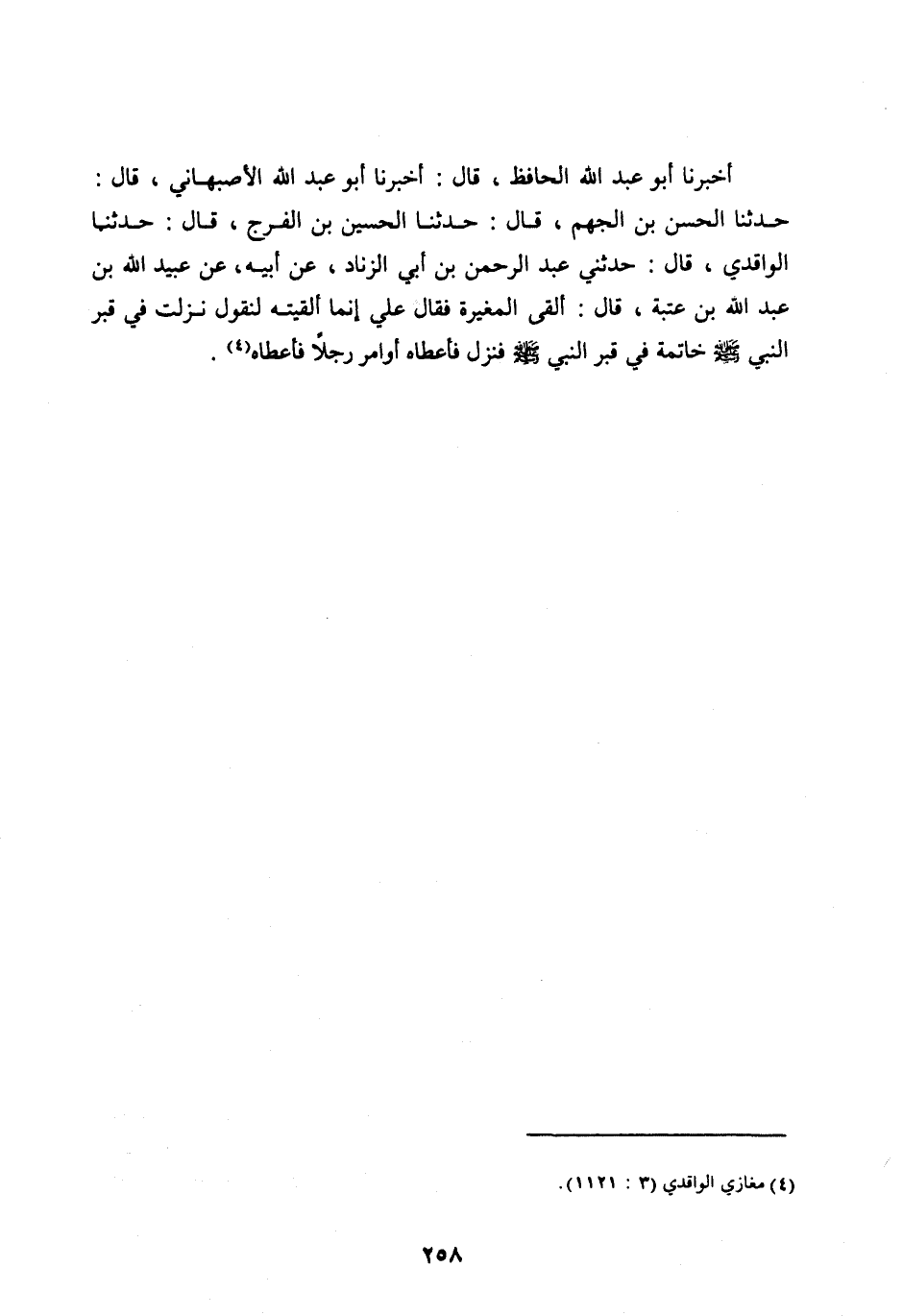حَدَّثَنَا الْحَسَنُ بْنُ الْجَهْمِ، قَالَ: حَدَّثَنَا الْحُسَيْنُ بْنُ الْفَرَجِ، قَالَ: حَدَّثَنَا الْوَاقِدِيُّ، قَالَ: حَدَّثَنِي عَبْدُ الرَّحْمَنِ بْنُ أَبِي الزِّنَادِ، عَنْ أَبِيهِ، عَنْ عُبَيْدِ اللهِ بْنِ عَبْدِ اللهِ بْنِ عُتْبَةَ، قَالَ: أَلْقَى الْمُغِيرَةُ فَقَالَ عَلِيٌّ إِنَّمَا أَلْقَيْتَهُ لِنَقُولَ نَزَلْتَ فِي قَبْرِ النبي صلى الله عليه وسلم خَاتِمَهُ فِي قَبْرِ النَّبِيِّ صَلَّى اللهُ عَلَيْهِ وسلم فنزل فأعطاه أوامر رجلا فأعطاه