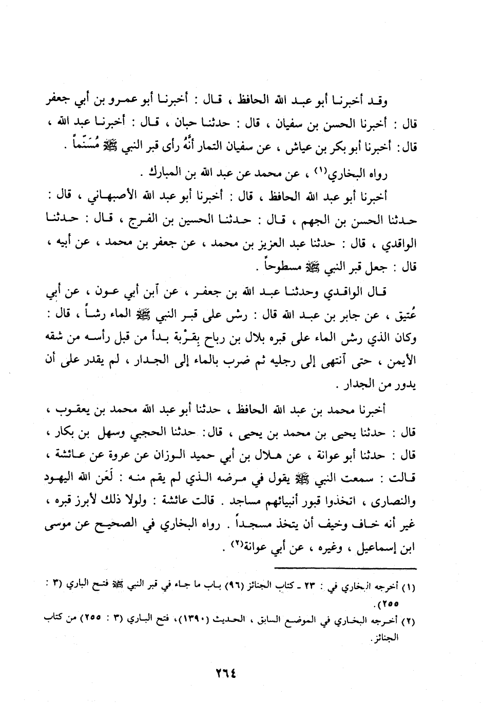 وَالنَّصَارَى، اتَّخَذُوا قُبُورَ أَنْبِيَائِهِمْ مَسَاجِدَ. قَالَتْ عَائِشَةُ: وَلَوْلَا ذَلِكَ لَأَبْرَزَ قَبْرَهُ، غَيْرَ أَنَّهُ خَافَ وَخِيفَ أَنْ يُتَّخَذَ مَسْجِدًا. رَوَاهُ الْبُخَارِيُّ فِي الصَّحِيحِ عن موسى ابن إِسْمَاعِيلَ، وَغَيْرِهِ، عَنْ أَبِي عَوَانَةَ [ (2) ] .