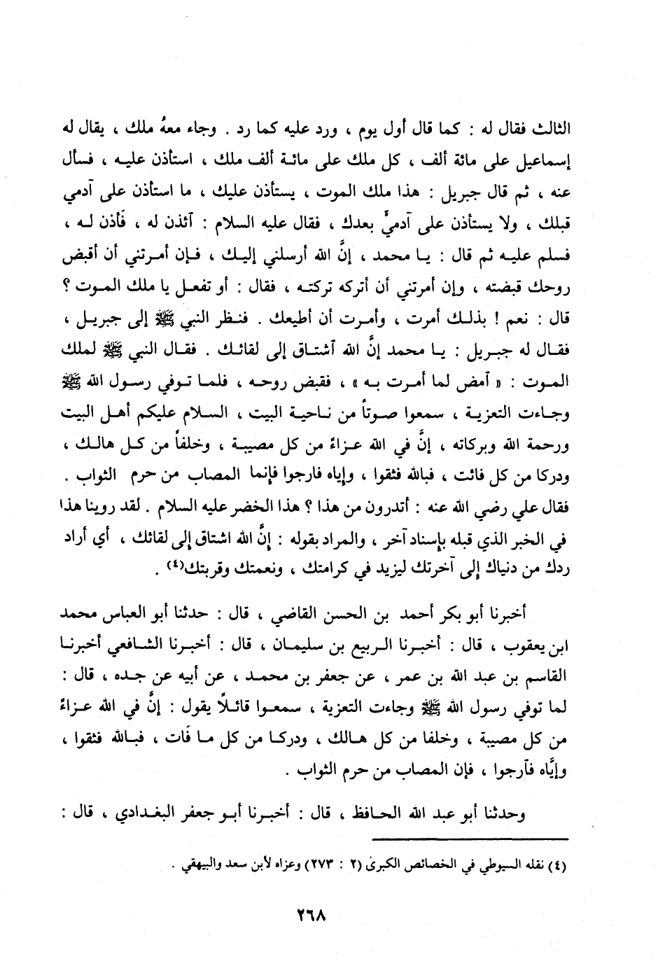 قَالَ: نَعَمْ! بِذَلِكَ أُمِرْتُ، وَأُمِرْتُ أَنْ أُطِيعَكَ. فَنَظَرَ النَّبِيُّ صَلَّى اللهُ عَلَيْهِ وسلم إِلَى جِبْرِيلَ، فَقَالَ لَهُ جِبْرِيلُ: يَا مُحَمَّدُ إِنَّ اللهَ اشْتَاقَ إِلَى لِقَائِكَ. فَقَالَ النَّبِيُّ صَلَّى اللهُ عَلَيْهِ وَسَلَّمَ لِمَلَكِ الْمَوْتِ: «امْضِ لِمَا أُمِرْتَ بِهِ» ، فَقَبَضَ رُوحَهُ، فَلَمَّا تُوُفِّيَ رَسُولُ اللهِ صَلَّى اللهُ عَلَيْهِ وَسَلَّمَ وَجَاءَتِ التَّعْزِيَةُ، سَمِعُوا صَوْتًا مِنْ نَاحِيَةِ الْبَيْتِ، السَّلَامُ عَلَيْكُمْ أَهْلَ الْبَيْتِ وَرَحْمَةُ اللهِ وَبَرَكَاتُهُ، إن في الله عزاء مِنْ كُلِّ مُصِيبَةٍ، وَخَلَفًا مِنْ كُلِّ هَالِكٍ، وَدَرْكًا مِنْ كُلِّ فَائِتٍ، فَبِاللهِ فَثِقُوا، وَإِيَّاهُ فَارْجُوا فَإِنَّمَا الْمُصَابُ مَنْ حُرِمَ الثَّوَابَ.
