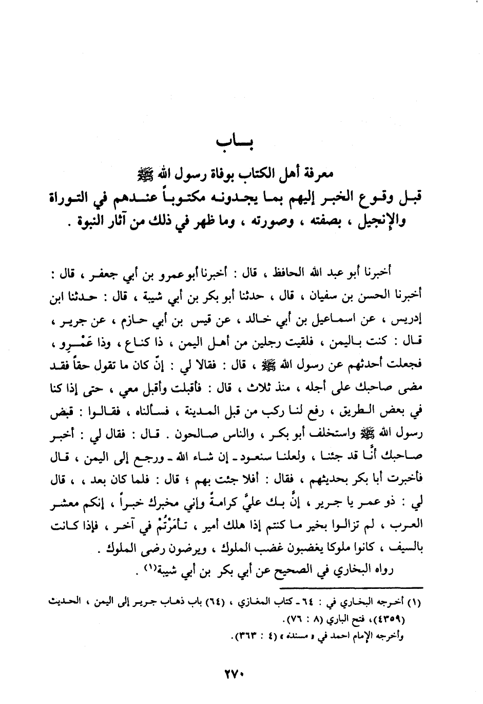 بَابُ مَعْرِفَةِ أَهْلِ الْكِتَابِ بِوَفَاةِ رَسُولِ اللهِ صَلَّى الله عليه وسلم قَبْلَ وُقُوعِ الْخَبَرِ إِلَيْهِمْ بِمَا يَجِدُونَهُ مَكْتُوبًا عِنْدَهُمْ فِي التَّوْرَاةِ وَالْإِنْجِيلِ، بِصِفَتِهِ، وَصُوَرَتِهِ، ومَا ظَهَرَ فِي ذَلِكَ مِنْ آثَارِ النُّبُوَّةِ.