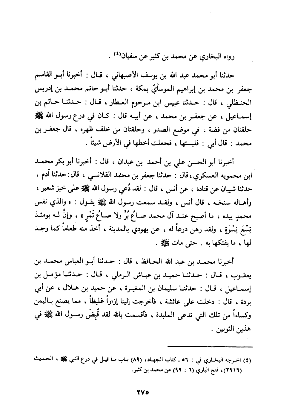 [ (4) ] أخرجه البخاري في: 56- كتاب الجهاد، (89) باب ما قيل في درع النبي صلى الله عليه وسلم، الحديث (2916) ، فتح الباري (6: 99) عَنْ مُحَمَّدِ بْنِ كَثِيرٍ.