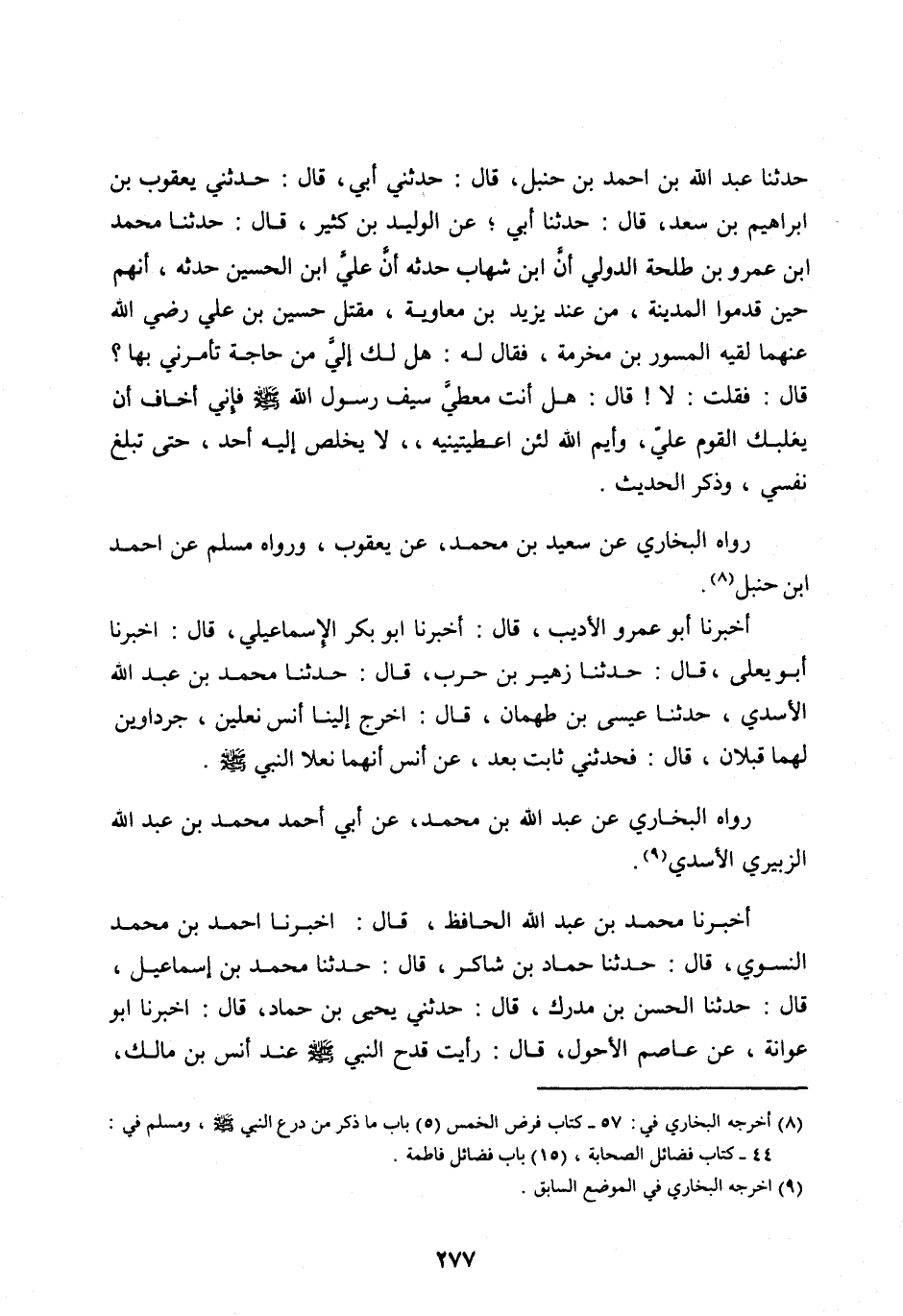 حَدَّثَنَا عَبْدُ اللهِ بْنُ أَحْمَدَ بْنِ حَنْبَلٍ، قَالَ: حَدَّثَنِي أَبِي، قَالَ: حَدَّثَنِي يَعْقُوبُ بْنُ إِبْرَاهِيمَ بْنِ سَعْدٍ، قَالَ: حَدَّثَنَا أَبِي، عَنِ الْوَلِيدِ بْنُ كَثِيرٍ، قَالَ: حَدَّثَنَا محمد ابن عَمْرِو بْنِ طَلْحَةَ الدُّوَلِيُّ أَنَّ ابْنَ شِهَابٍ حَدَّثَهُ أنّ عليّ ابن الْحُسَيْنِ حَدَّثَهُ، أَنَّهُمْ حِينَ قَدِمُوا الْمَدِينَةَ، مِنْ عِنْدِ يَزِيدَ بْنِ مُعَاوِيَةَ، مَقْتَلَ حُسَيْنِ بْنِ عَلِيٍّ رَضِيَ اللهُ عَنْهُمَا لَقِيَهُ الْمِسْوَرُ بْنُ مَخْرَمَةَ، فَقَالَ لَهُ: هَلْ لَكَ إِلَيَّ مِنْ حَاجَةٍ تَأْمُرُنِي بِهَا؟