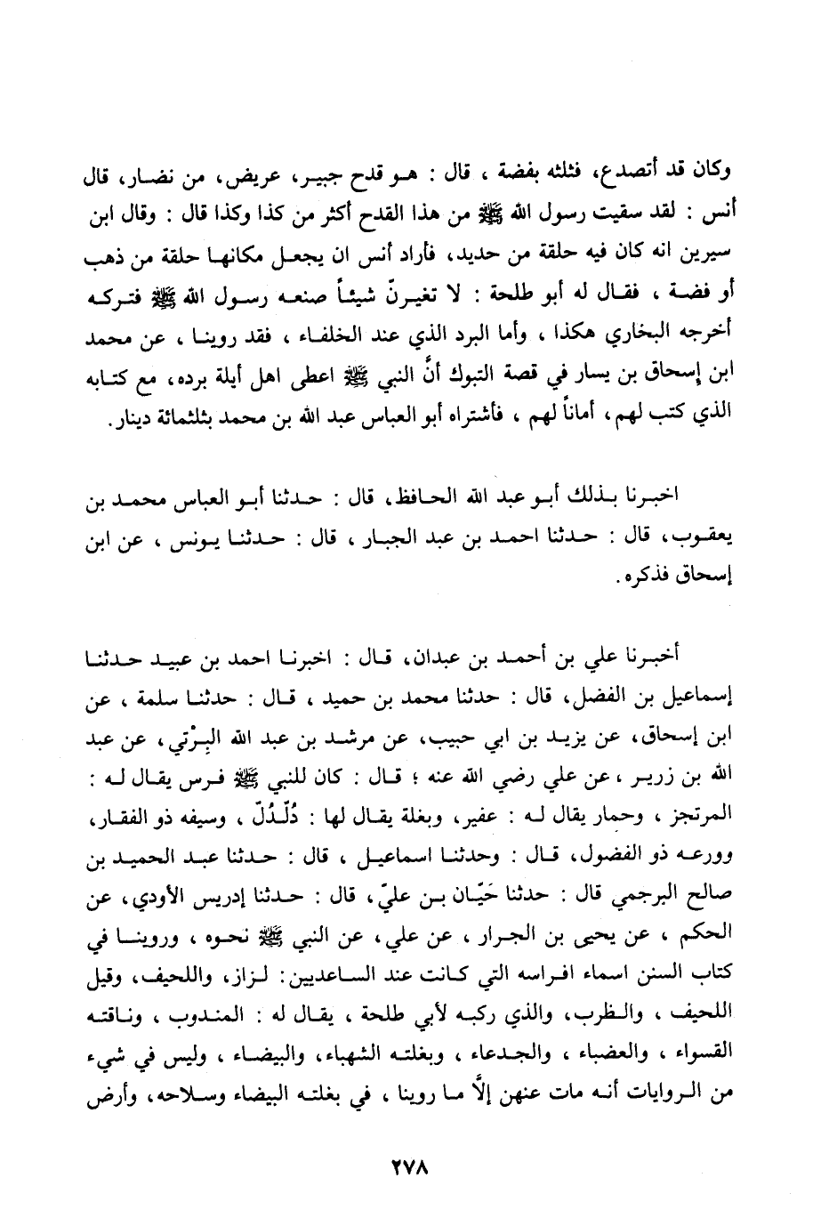 الْمُرْتَجِزُ، وَحِمَارٌ يُقَالُ لَهُ: عُفَيْرٌ، وَبَغْلَةٌ يُقَالُ لَهَا: دُلْدُلُ، وسيفه ذو الفقار، وورعه ذُو الْفُضُولِ، قَالَ: وَحَدَّثَنَا إِسْمَاعِيلُ، قَالَ: حَدَّثَنَا عَبْدُ الْحَمِيدِ بْنُ صَالِحٍ الْبُرْجُمِيُّ قَالَ: حَدَّثَنَا حَيَّانُ بْنُ عَلِيٍّ، قَالَ: حَدَّثَنَا إِدْرِيسُ الْأَوْدِيُّ، عَنِ الْحَكَمِ، عَنْ يَحْيَى بن الجرار، عَنْ عَلِيٍّ، عَنِ النَّبِيِّ صَلَّى اللهُ عَلَيْهِ وسلم نَحْوَهُ، وَرُوِّينَا فِي كِتَابِ السُّنَنِ أَسْمَاءَ أَفْرَاسِهِ الَّتِي كَانَتْ عِنْدَ السَّاعِدِيِّينَ: لِزَازُ، وَاللَّحِيفُ، وَقِيلَ اللُّحَيْفُ، وَالظِّرْبُ، وَالَّذِي رَكِبَهُ لِأَبِي طَلْحَةَ، يُقَالُ لَهُ: الْمَنْدُوبُ، وَنَاقَتُهُ القسواء، وَالْعَضْبَاءُ، وَالْجَدْعَاءُ، وَبَغْلَتُهُ الشَّهْبَاءُ، وَالْبَيْضَاءُ، وَلَيْسَ فِي شَيْءٍ مِنَ الرِّوَايَاتِ أَنَّهُ مَاتَ عَنْهُنَّ إِلَّا مَا رُوِّينَا، فِي بَغْلَتِهِ الْبَيْضَاءِ وَسِلَاحِهِ، وَأَرْضٍ