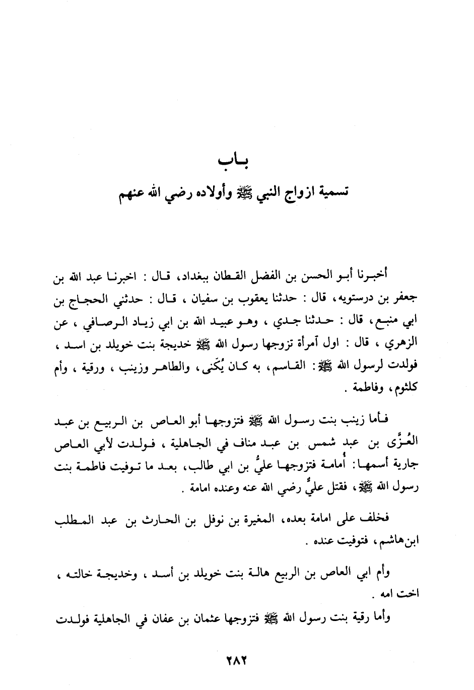 أَخْبَرَنَا أَبُو الْحَسَنِ بْنُ الْفَضْلِ الْقَطَّانُ بِبَغْدَادَ، قَالَ: أَخْبَرَنَا عَبْدُ اللهِ بْنُ جَعْفَرِ بْنِ دُرُسْتَوَيْهِ، قَالَ: حَدَّثَنَا يَعْقُوبُ بْنُ سُفْيَانَ، قَالَ: حَدَّثَنِي الْحَجَّاجُ بْنُ أَبِي مَنْبَعٍ، قَالَ: حَدَّثَنَا جَدِّي، وَهُوَ عُبَيْدُ اللهِ بْنُ أَبِي زِيَادٍ الرُّصَافِيُّ، عَنِ الزُّهْرِيِّ، قَالَ: أَوَّلُ امْرَأَةٍ تَزَوَّجَهَا رَسُولُ اللهِ صَلَّى الله عليه وسلم خَدِيجَةُ بِنْتُ خُوَيْلِدُ بْنُ أَسَدٍ، فَوَلَدَتْ لِرَسُولِ اللهِ صَلَّى الله عليه وسلم: الْقَاسِمَ، بِهِ كَانَ يُكْنَى، وَالطَّاهِرَ وَزَيْنَبَ، وَرُقَيَّةَ، وَأُمَّ كُلْثُومٍ، وَفَاطِمَةَ.