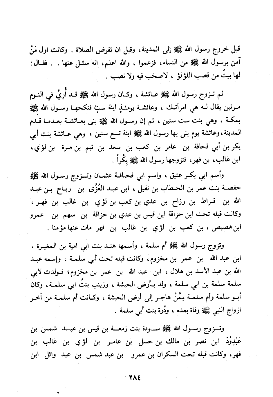 ثُمَّ تَزَوَّجَ رَسُولُ اللهِ صَلَّى اللهُ عَلَيْهِ وَسَلَّمَ عَائِشَةَ، وَكَانَ رَسُولُ اللهِ صَلَّى الله عليه وسلم قَدْ أُرِيَ فِي النَّوْمِ مَرَّتَيْنِ يُقَالُ لَهُ هِيَ امْرَأَتُكُ، وَعَائِشَةُ يَوْمَئِذٍ ابْنَةُ سِتٍّ فَنَكَحَهَا رَسُولُ اللهِ صَلَّى اللهُ عَلَيْهِ وَسَلَّمَ بِمَكَّةَ، وَهِيَ بِنْتُ سِتِّ سِنِينَ، ثُمَّ إِنَّ رَسُولَ اللهِ صَلَّى اللهُ عَلَيْهِ وسلم بنى بعائشة بَعْدَ مَا قَدِمَ الْمَدِينَةَ، وَعَائِشَةُ يَوْمَ بَنَى بِهَا رَسُولُ اللهِ صَلَّى اللهُ عليه وسلم ابْنَةُ تِسْعِ سِنِينَ، وَهِيَ عَائِشَةُ بِنْتُ أَبِي بَكْرِ بْنِ أَبِي قُحَافَةَ، بْنِ عَامِرِ، بْنِ كَعْبِ، بْنِ سَعْدِ، بْنِ تَيْمِ بْنِ مرة، بن لؤي، ابن غَالِبِ، بْنِ فِهْرٍ، فَتَزَوَّجَهَا رَسُولُ اللهِ صَلَّى الله عَلَيْهِ وَسَلَّمَ بٌكرا.