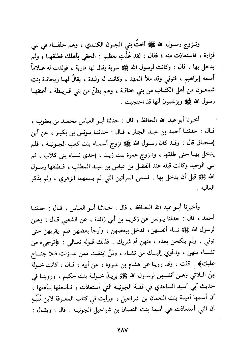 وَتَزَوُّجِ رَسُولِ اللهِ صَلَّى اللهُ عَلَيْهِ وَسَلَّمَ أُخْتَ بَنِي الْجَوْنِ الْكِنْدِيِّ، وَهُمْ حُلَفَاءُ فِي بَنِي فَزَارَةَ، فاستعازت مِنْهُ، فَقَالَ: لَقَدْ عُذْتِ بِعَظِيمٍ: الْحَقِي بِأَهْلِكِ فَطَلَّقَهَا، وَلَمْ يَدْخُلْ بِهَا. قَالَ: وَكَانَتْ لِرَسُولِ اللهِ صَلَّى اللهُ عليه وسلم سُرِّيَّةٌ يُقَالُ لَهَا مَارِيَةُ، فَوَلَدَتْ لَهُ غُلَامًا اسْمُهُ إِبْرَاهِيمَ، فَتُوُفِّيَ وَقَدْ مَلَأَ الْمَهْدَ، وَكَانَتْ لَهُ وَلِيدَةٌ، يُقَالُ لَهَا رَيْحَانَةُ بِنْتُ شَمْعُونَ مِنْ أَهْلِ الْكِتَابِ مِنْ بَنِي خَنَاقَةَ، وَهُمْ بَطْنٌ مِنْ بَنِي قُرَيْظَةَ، أَعْتَقَهَا رَسُولُ اللهِ صلى الله عَلَيْهِ وَسَلَّمَ وَيَزْعُمُونَ أَنَّهَا قَدِ احْتَجَبَتْ.