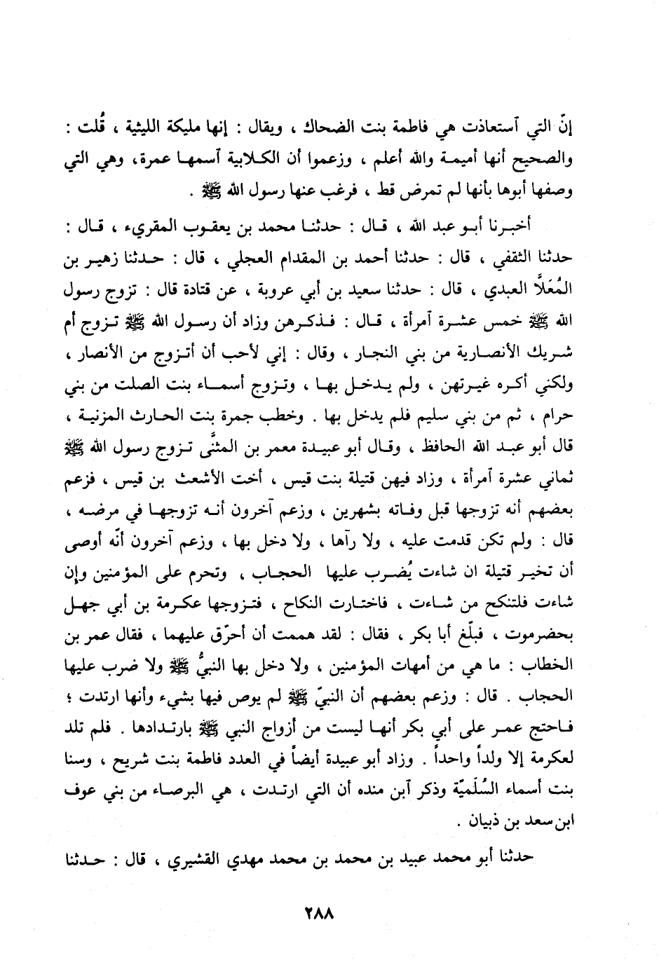 حَدَّثَنَا الثَّقَفِيُّ، قَالَ: حَدَّثَنَا أَحْمَدُ بْنُ الْمِقْدَامِ الْعِجْلِيُّ، قَالَ: حَدَّثَنَا زُهَيْرُ بْنُ المعلّا الْعَبْدِيُّ، قَالَ: حَدَّثَنَا سَعِيدُ بْنُ أَبِي عَرُوبَةَ، عَنْ قَتَادَةَ قَالَ: تَزَوَّجَ رَسُولُ اللهِ صَلَّى اللهُ عَلَيْهِ وَسَلَّمَ خَمْسَ عَشْرَةَ امْرَأَةً، قَالَ: فَذَكَّرَهُنَّ وَزَادَ أَنَّ رسول الله صلى اللهُ عَلَيْهِ وَسَلَّمَ تَزَوَّجَ أُمَّ شَرِيكٍ الْأَنْصَارِيَّةَ مِنْ بَنِي النَّجَّارِ، وَقَالَ: إِنِّي لَأُحِبُّ أَنْ أَتَزَوَّجَ مِنَ الْأَنْصَارِ، وَلَكِنِّي أَكْرَهُ غَيْرَتَهُنَّ، وَلَمْ يَدْخُلْ بِهَا، وَتَزَوَّجَ أَسْمَاءَ بِنْتَ الصَّلْتِ مِنْ بَنِي حَرَامٍ، ثُمَّ مِنْ بَنِي سُلَيْمٍ فَلَمْ يَدْخُلْ بِهَا. وَخَطَبَ جَمْرَةَ بِنْتَ الْحَارِثِ الْمُزَنِيَّةِ، قَالَ أَبُو عَبْدِ اللهِ الْحَافِظُ، وَقَالَ أَبُو عُبَيْدَةُ مَعْمَرُ بْنُ الْمُثَنَّى تَزَوَّجَ رَسُولُ اللهِ صَلَّى اللهُ عَلَيْهِ وَسَلَّمَ ثَمَانِيَ عَشْرَةَ امْرَأَةً، وَزَادَ فِيهِنَّ قُتَيْلَةَ بِنْتَ قَيْسٍ، أُخْتَ الْأَشْعَثِ بْنِ قَيْسٍ، فَزَعَمَ بَعْضُهُمْ أَنَّهُ تَزَوَّجَهَا قَبْلَ وَفَاتِهِ بِشَهْرَيْنِ، وَزَعَمَ آخَرُونَ أَنَّهُ تَزَوَّجَهَا فِي مَرَضِهِ، قَالَ: وَلَمْ تَكُنْ قَدِمَتْ عَلَيْهِ، وَلَا رَآهَا، وَلَا دَخَلَ بِهَا، وَزَعَمَ آخَرُونَ أَنَّهُ أَوْصَى أَنْ تُخَيَّرَ قُتَيْلَةُ إِنْ شَاءَتْ يُضْرَبْ عَلَيْهَا الْحِجَابُ، وَتَحْرُمُ عَلَى الْمُؤْمِنِينَ وَإِنْ شَاءَتْ فَلْتَنْكِحْ مَنْ شَاءَتْ، فَاخْتَارَتِ النِّكَاحَ، فَتَزَوَّجَهَا عِكْرِمَةُ بْنُ أَبِي جَهْلٍ بِحَضْرَمَوْتَ، فَبَلَغَ أَبَا بَكْرٍ، فَقَالَ: لَقَدْ هَمَمْتُ أَنْ أُحَرِّقَ عَلَيْهِمَا، فَقَالَ عُمَرُ بْنُ الْخَطَّابِ: مَا هِيَ مِنْ أُمَّهَاتِ الْمُؤْمِنِينَ، وَلَا دَخَلَ بِهَا النَّبِيَّ صَلَّى اللهُ عليه وسلم وَلَا ضَرَبَ عَلَيْهَا الْحِجَابَ. قَالَ: وَزَعَمَ بَعْضُهُمْ أَنَّ النَّبِيَّ صَلَّى اللهُ عليه وَسَلَّمَ لَمْ يُوصِ فِيهَا بِشَيْءٍ وَأَنَّهَا ارْتَدَّتْ، فَاحْتَجَّ عُمَرُ عَلَى أَبِي بَكْرٍ أَنَّهَا لَيْسَتْ مِنْ أَزْوَاجِ النَّبِيِّ صَلَّى اللهُ عَلَيْهِ وَسَلَّمَ بِارْتِدَادِهَا. فَلَمْ تَلِدْ لِعِكْرِمَةَ إِلَّا وَلَدًا وَاحِدًا. وَزَادَ أَبُو عُبَيْدَةَ أَيْضًا فِي الْعَدَدِ فَاطِمَةَ بِنْتَ شُرَيْحٍ، وَسَنَا بِنْتَ أَسْمَاءَ السُّلَمِيَّةَ وَذَكَرَ ابْنُ مَنْدَهٍ أَنَّ الَّتِي ارْتَدَّتْ، هِيَ الْبَرْصَاءُ مِنْ بَنِي عَوْفِ ابن سَعْدِ بْنِ ذِبْيَانَ.