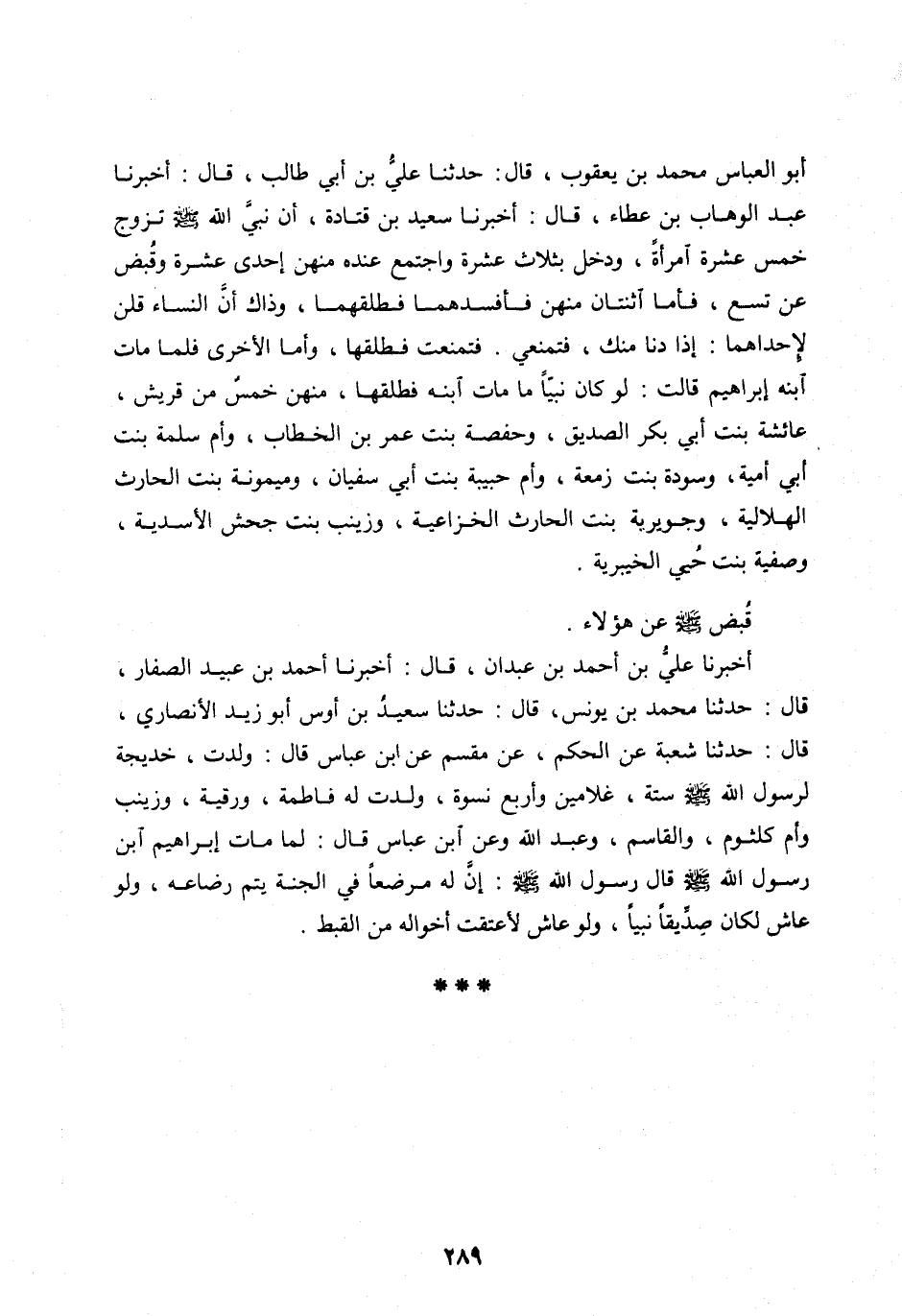 أَبُو الْعَبَّاسِ مُحَمَّدُ بْنُ يَعْقُوبَ، قَالَ: حَدَّثَنَا عَلِيُّ بْنُ أَبِي طَالِبٍ، قَالَ: أَخْبَرَنَا عَبْدُ الْوَهَّابِ بْنُ عَطَاءٍ، قَالَ: أَخْبَرَنَا سَعِيدٌ بْنُ قَتَادَةَ، أَنَّ نَبِيَّ اللهِ صَلَّى اللهُ عَلَيْهِ وَسَلَّمَ تَزَوَّجَ خَمْسَ عَشْرَةَ امْرَأَةً، وَدَخَلَ بِثَلَاثَ عَشْرَةَ وَاجْتَمَعَ عِنْدَهُ مِنْهُنَّ إِحْدَى عَشْرَةَ وَقُبِضَ عَنْ تِسْعٍ، فَأَمَّا اثْنَتَانِ مِنْهُنَّ فَأَفْسَدَهُمَا فَطَلَّقَهُمَا، وَذَاكَ أَنَّ النِّسَاءَ قُلْنَ لِإِحْدَاهُمَا: إِذَا دَنَا مِنْكِ، فَتَمَنَّعِي. فَتَمَنَّعَتْ فَطَلَّقَهَا، وَأَمَّا الْأُخْرَى فَلَمَّا مَاتَ ابْنُهُ إِبْرَاهِيمُ قَالَتْ: لَوْ كَانَ نَبِيًّا مَا مَاتَ ابْنُهُ فَطَلَّقَهَا، مِنْهُنَّ خَمْسٌ مِنْ قُرَيْشٍ، عَائِشَةُ بِنْتُ أَبِي بَكْرٍ الصِّدِّيقِ، وَحَفْصَةُ بِنْتِ عُمَرَ بْنِ الْخَطَّابِ، وَأُمُّ سَلَمَةَ بِنْتُ أَبِي أُمَيَّةَ، وَسَوْدَةُ بِنْتُ زَمْعَةَ، وَأُمُّ حبيبة بنت أبي سفيان، وَمَيْمُونَةُ بِنْتُ الْحَارِثِ الْهِلَالِيَّةُ، وَجُوَيْرِيَةُ بِنْتُ الْحَارِثِ الْخُزَاعِيَّةُ، وَزَيْنَبُ بِنْتُ جَحْشٍ الْأَسَدِيَّةُ، وَصَفِيَّةُ بِنْتُ حُيَيٍّ الْخَيْبَرِيَّةُ.