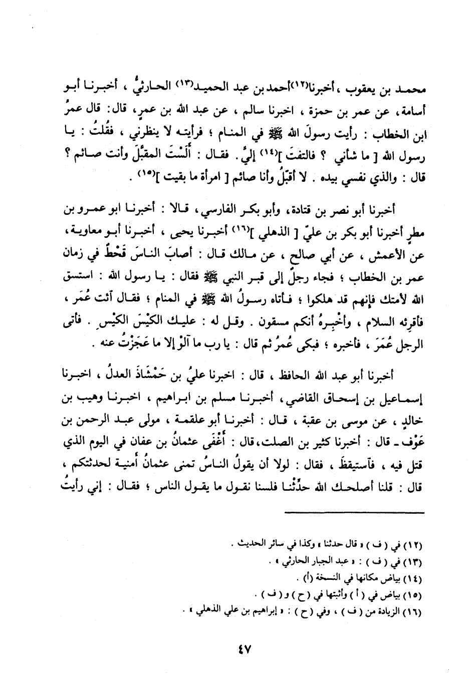 مُحَمَّدُ بْنُ يَعْقُوبَ، أَخْبَرَنَا [ (12) ] أَحْمَدُ بْنُ عَبْدِ الْحَمِيدِ [ (13) ] الْحَارِثِيُّ، أَخْبَرَنَا أَبُو أُسَامَةَ، عَنِ عُمَرَ بْنِ حَمْزَةَ، أَخْبَرَنَا سَالِمٌ، عَنْ عَبْدِ اللهِ بْنِ عُمَرَ، قَالَ: قَالَ عُمَرُ ابن الْخَطَّابِ: رَأَيْتُ رَسُولَ اللهِ صَلَّى اللهُ عَلَيْهِ وَسَلَّمَ فِي الْمَنَامِ، فَرَأَيْتُهُ لَا يَنْظُرُنِي، فَقُلْتُ: يَا رَسُولَ اللهِ [مَا شَأْنِي؟ فَالْتَفَتَ] [ (14) ] إِلَيَّ. فَقَالَ: أَلَسْتَ الْمُقَبِّلَ وَأَنْتَ صَائِمٌ؟