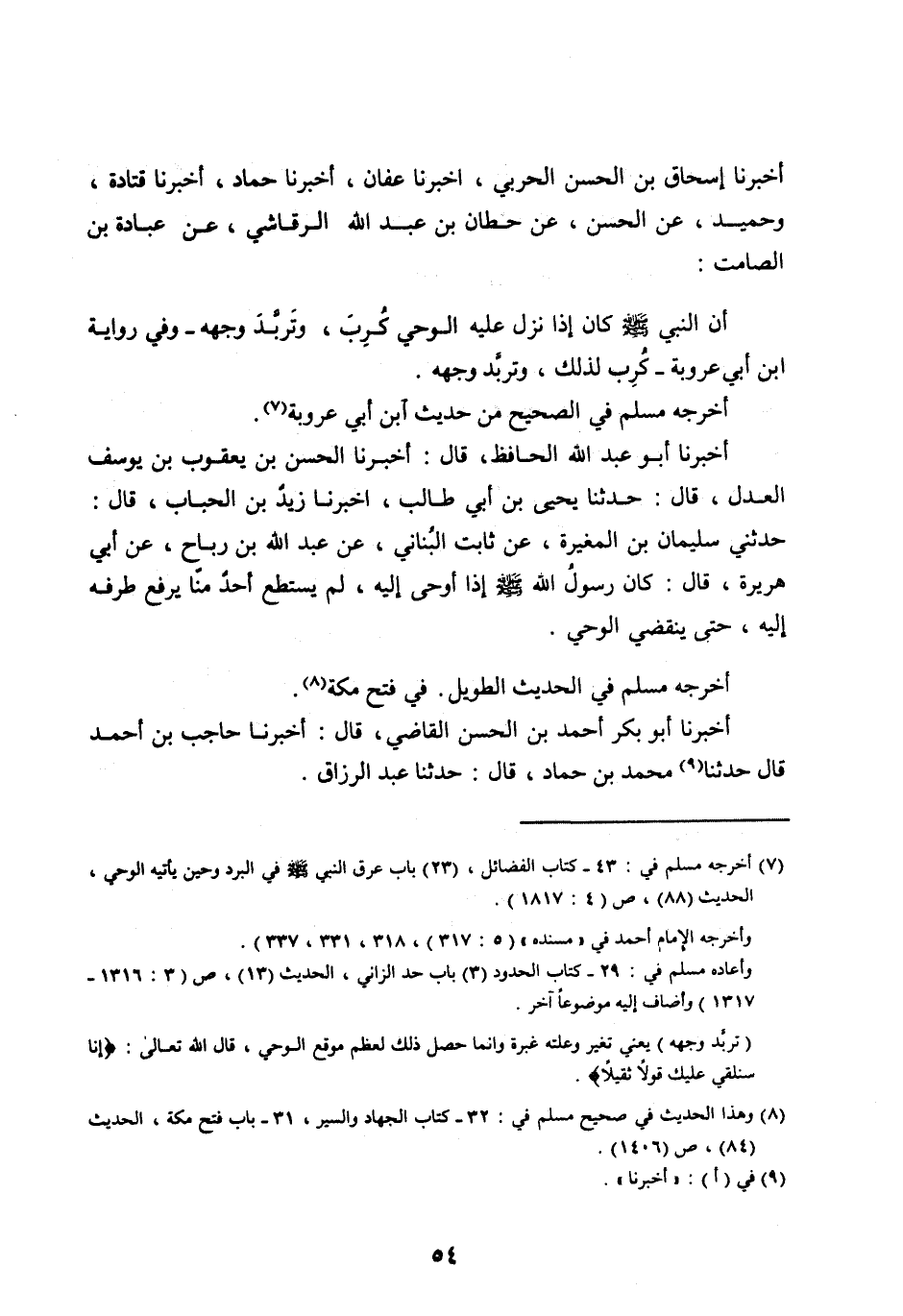 حَدَّثَنِي سُلَيْمَانَ بْنِ الْمُغِيرَةِ، عَنْ ثَابِتٍ الْبُنَانِيِّ، عَنْ عَبْدِ اللهِ بْنِ رَبَاحٍ، عَنْ أَبِي هُرَيْرَةَ، قَالَ: كَانَ رَسُولُ اللهِ صَلَّى اللهُ عَلَيْهِ وَسَلَّمَ إِذَا أُوحِيَ إِلَيْهِ، لَمْ يَسْتَطِعْ أَحَدٌ مِنَّا يَرْفَعُ طَرْفَهُ إِلَيْهِ، حَتَّى يَنْقَضِيَ الْوَحْيُ.