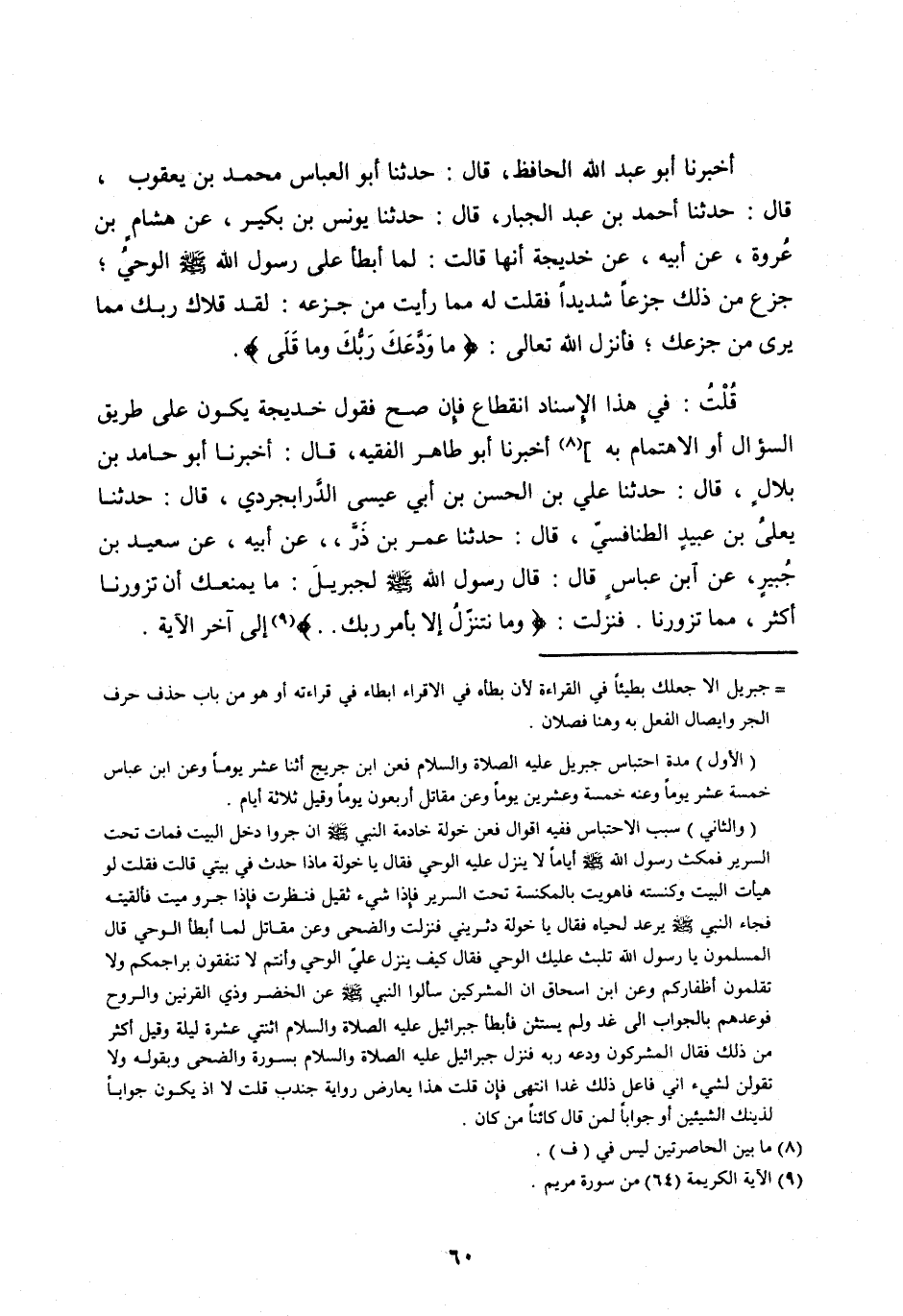 أَخْبَرَنَا أَبُو عَبْدِ اللهِ الْحَافِظُ، قَالَ: حَدَّثَنَا أَبُو الْعَبَّاسِ مُحَمَّدُ بْنُ يَعْقُوبَ،، قَالَ: حَدَّثَنَا أَحْمَدُ بْنُ عَبْدِ الْجَبَّارِ، قَالَ: حَدَّثَنَا يُونُسُ بْنُ بُكَيْرٍ، عَنْ هِشَامِ بْنِ عُرْوَةَ، عَنْ أَبِيهِ، عَنْ خَدِيجَةَ أَنَّهَا قَالَتْ: لَمَّا أَبْطَأَ عَلَى رسول الله صلى اللهُ عَلَيْهِ وَسَلَّمَ الْوَحْيُ، جَزِعَ مِنْ ذَلِكَ جَزَعًا شَدِيدًا فَقُلْتُ لَهُ مِمَّا رَأَيْتُ مِنْ جَزَعِهِ: لَقَدْ قَلَاكَ رَبُّكَ مِمَّا يَرَى مِنْ جَزَعِكَ، فَأَنْزَلَ اللهُ تَعَالَى: مَا وَدَّعَكَ رَبُّكَ وَما قَلى.