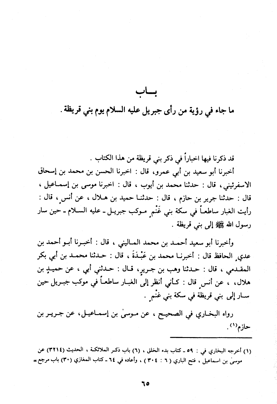[ (1) ] أخرجه البخاري في: 59- كتاب بدء الخلق، (6) باب ذكر الملائكة، الحديث (3214) عَنْ مُوسَى بْنِ إِسْمَاعِيلَ، فتح الباري (6: 304) ، وأعاده في 64- كتاب المغازي (30) باب مرجع
