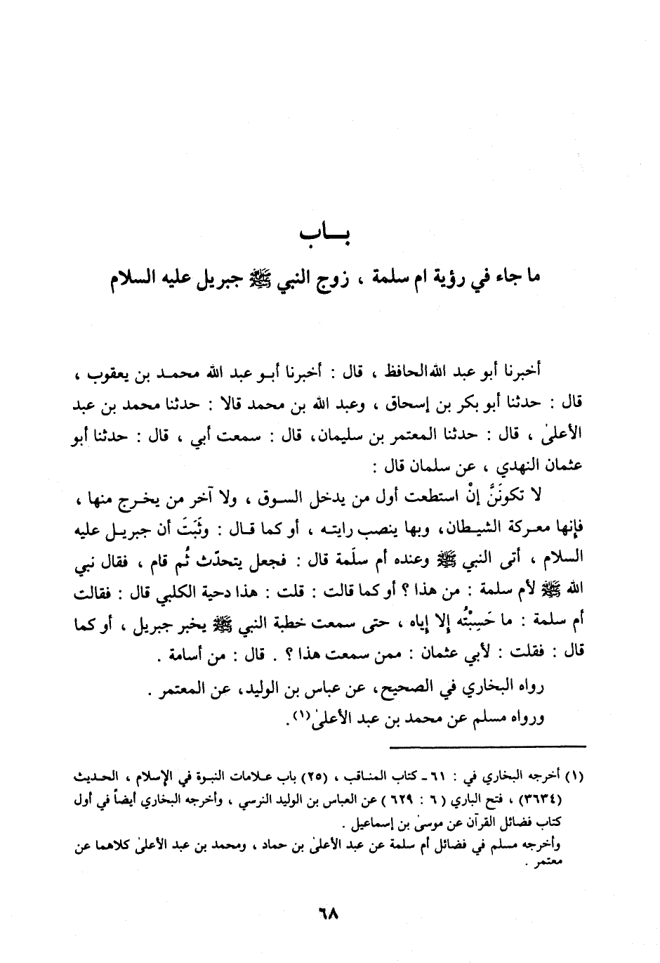 أَخْبَرَنَا أَبُو عَبْدِ اللهِ الْحَافِظُ، قَالَ: أَخْبَرَنَا أَبُو عَبْدِ اللهِ مُحَمَّدُ بْنُ يَعْقُوبَ، قَالَ: حَدَّثَنَا أَبُو بَكْرِ بْنُ إِسْحَاقَ، وَعَبْدُ اللهِ بْنُ مُحَمَّدٍ قَالَا: حَدَّثَنَا مُحَمَّدُ بْنُ عَبْدِ الْأَعْلَى، قَالَ: حَدَّثَنَا الْمُعْتَمِرُ بْنُ سُلَيْمَانَ، قَالَ: سَمِعْتُ أَبِي، قَالَ: حَدَّثَنَا أَبُو عُثْمَانَ النَّهْدِيُّ، عَنْ سَلْمَانَ قَالَ: لَا تَكُونَنَّ إِنِ اسْتَطَعْتَ أَوَّلَ مَنْ يَدْخُلُ السُّوقَ، وَلَا آخِرَ مَنْ يَخْرُجُ مِنْهَا، فَإِنَّهَا مَعْرَكَةُ الشَّيْطَانِ، وَبِهَا يَنْصُبُ رَايَتَهُ، أَوْ كَمَا قَالَ: وَثَبُتَ أَنَّ جِبْرِيلَ عَلَيْهِ السَّلَامُ، أَتَى النَّبِيَّ صَلَّى الله عَلَيْهِ وَسَلَّمَ وَعِنْدَهُ أُمُّ سَلَمَةَ قَالَ: فَجَعَلَ يَتَحَدَّثُ ثُمَّ قَامَ، فَقَالَ نَبِيُّ اللهِ صَلَّى الله عليه وَسَلَّمَ لِأُمِّ سَلَمَةَ: مَنْ هَذَا؟ أَوْ كَمَا قَالَتْ: قُلْتُ: هَذَا دِحْيَةُ الْكَلْبِيُّ قَالَ: فَقَالَتْ أُمُّ سَلَمَةَ: مَا حَسِبْتُهُ إِلَّا إِيَّاهُ، حَتَّى سَمِعْتُ خُطْبَةِ النَّبِيِّ صَلَّى اللهُ عليه وسلم يُخْبِرُ جِبْرِيلَ، أَوْ كَمَا قَالَ: فَقُلْتُ: لِأَبِي عُثْمَانَ: مِمَّنْ سَمِعْتَ هَذَا؟. قَالَ: مِنْ أُسَامَةَ.