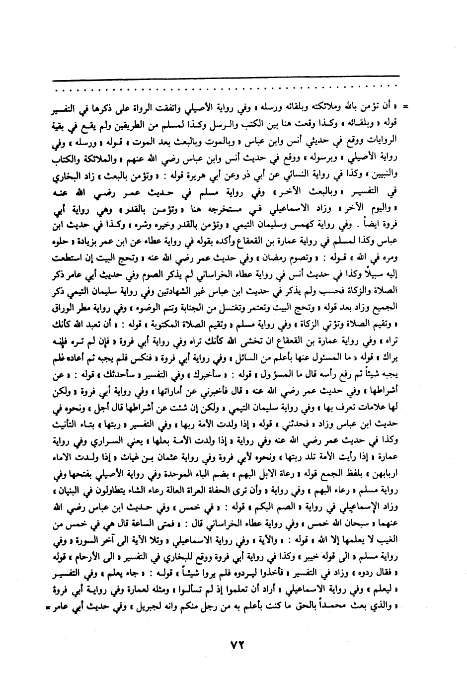 [ () ] «أن تؤمن بالله وملائكته وبلقائه ورسله» وفي رواية الأصيلي واتفقت الرواة على ذكرها في التفسير قوله «وبلقائه» وكذا وقعت هنا بين الكتب والرسل وكذا لمسلم من الطريقين ولم يقع في بقية الروايات ووقع في حديثي أنس وابن عباس «وبالموت وبالبعث بعد الموت» قوله «ورسله» وفي رواية الأصيلي «وبرسوله» ووقع في حديث أنس وابن عباس رضي الله عنهم «والملائكة والكتاب والنبيين» وكذا في رواية النسائي عن أبي ذر وعن أبي هريرة قوله: «وتؤمن بالبعث» زاد البخاري في التفسير «وبالبعث الآخر» وفي رواية مسلم في حديث عمر رضي الله عنه «واليوم الآخر» وزاد الاسماعيلي في مستخرجه هنا «وتؤمن بالقدر» وهي رواية أبي فروة ايضا. وفي رواية كهمس وسليمان التيمي «وتؤمن بالقدر وخيره وشره» وكذا في حديث ابن عباس وكذا لمسلم في رواية عمارة بن القعقاع وأكده بقوله في رواية عطاء عن ابن عمر بزيادة «حلوه ومره في الله» قوله: «وتصوم رمضان» وفي حديث عمر رضي الله عنه «وتحج البيت إن استطعت إليه سبيلا وكذا في حديث أنس في رواية عطاء الخراساني لم يذكر الصوم وفي حديث أبي عامر ذكر الصلاة والزكاة فحسب ولم يذكر في حديث ابن عباس غير الشهادتين وفي رواية سليمان التيمي ذكر الجميع وزاد بعد قوله «وتحج البيت وتعتمر وتغتسل من الجنابة وتتم الوضوء» وفي رواية مطر الوراق «وتقيم الصلاة وتؤتي الزكاة» وفي رواية مسلم «وتقيم الصلاة المكتوبة» قوله: «أن تعبد الله كأنك تراه» وفي رواية عمارة بن القعقاع ان تخشى الله كأنك تراه وفي رواية أبي فروة «فإن لم تره فإنه يراك» قوله «ما المسئول عنها بأعلم من السائل» وفي رواية أبي فروة «فنكس فلم يجبه ثم أعاده فلم يجبه شيئا ثم رفع رأسه قال ما المسؤول» قوله: «سأخبرك» وفي التفسير «سأحدثك» قوله: «عن أشراطها» وفي حديث عمر رضي الله عنه «قال فأخبرني عن أماراتها» وفي رواية أبي فروة «ولكن لها علامات تعرف بها» وفي رواية سليمان التيمي «ولكن إن شئت عن أشراطها قال أجل» ونحوه في حديث ابن عباس وزاد «فحدثني» قوله «إذا ولدت الأمة ربها» وفي التفسير «ربتها» بتاء التأنيث وكذا في حديث عمر رضي الله عنه وفي رواية «إذا ولدت الأمة بعلها» يعني السراري وفي رواية عمارة «إذا رأيت الأمة تلد ربتها» ونحوه لأبي فروة وفي رواية عثمان بن غياث «إذا ولدت الإماء اربابهن» بلفظ الجمع قوله «رعاة الإبل البهم» بضم الباء الموحدة وفي رواية الأصيلي بفتحها وفي رواية مسلم «رعاء البهم» وفي رواية «وأن ترى الحفاة العراة العالة رعاء الشاء يتطاولون في البنيان» وزاد الإسماعيلي في رواية «الصم البكم» قوله: «في خمس» وفي حديث ابن عباس رضي الله عنهما «سبحان الله خمس» وفي رواية عطاء الخراساني قال: «فمتى الساعة قال هي في خمس من الغيب لا يعلمها إلا الله» قوله: «والآية» وفي رواية الاسماعيلي «وتلا الآية الى آخر السورة «وفي رواية مسلم «الى قوله خيبر» وكذا في رواية أبي فروة ووقع للبخاري في التفسير «الى الأرحام» قوله «فقال ردوه» وزاد في التفسير «فأخذوا ليردوه فلم يروا شيئا» قوله: «جاء يعلم» وفي التفسير «ليعلم» وفي رواية الاسماعيلي «أراد أن تعلموا إذ لم تسألوا» ومثله لعمارة وفي رواية أبي فروة «والذي بعث محمدا بالحق ما كنت بأعلم به من رجل منكم وانه لجبريل» وفي حديث أبي عامر