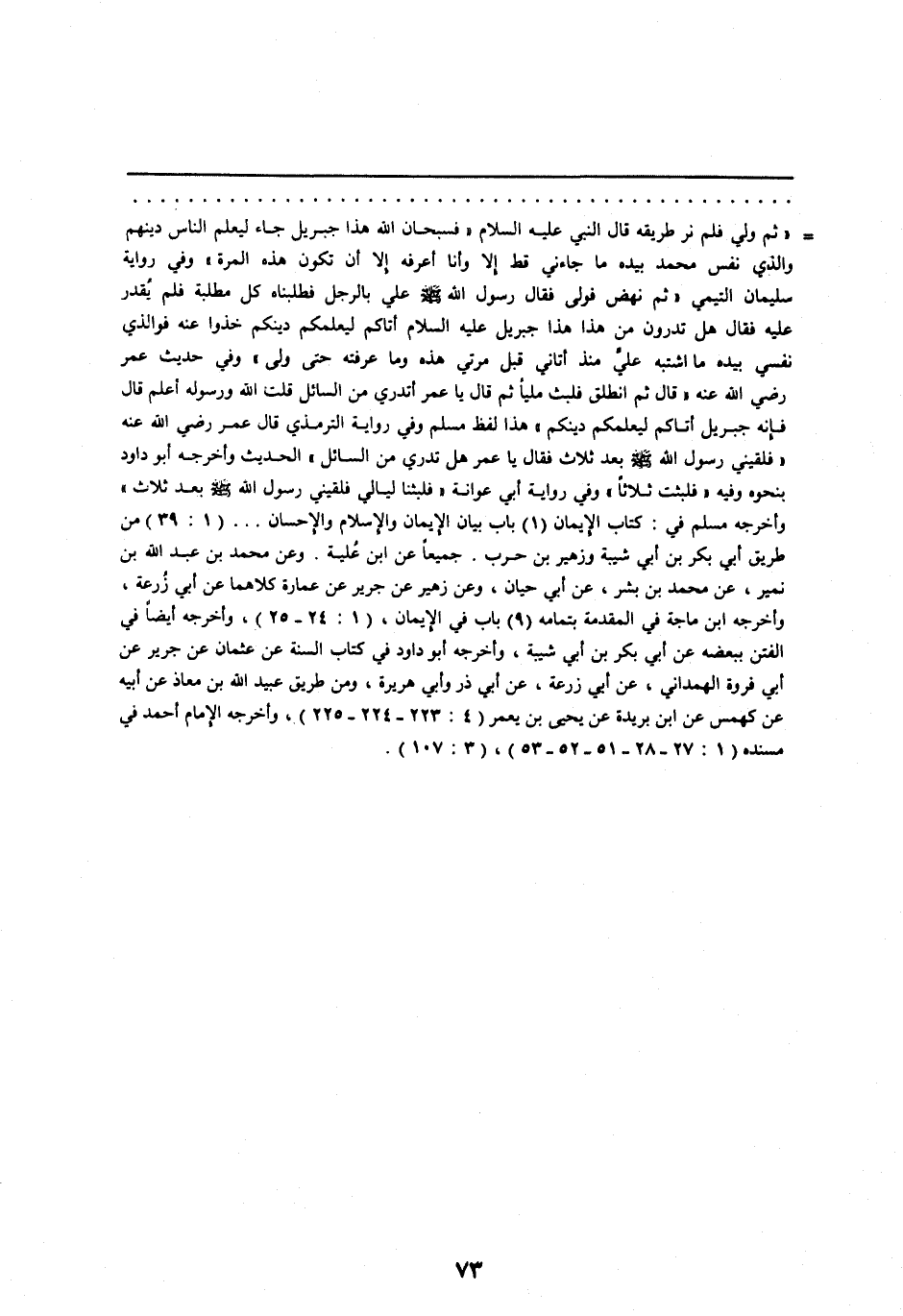 [ () ] «ثم ولي فلم نر طريقه قال النبي عليه السّلام «فسبحان الله هذا جبريل جاء ليعلم الناس دينهم والذي نفس محمد بيده ما جاءني قط إلا وأنا أعرفه إلا أن تكون هذه المرة» وفي رواية سليمان التيمي «ثم نهض فولى فقال رسول الله صلّى الله عليه وسلم علي بالرجل فطلبناه كل مطلبة فلم يقدر عليه فقال هل تدرون من هذا هذا جبريل عليه السّلام أتاكم ليعلمكم دينكم خذوا عنه فو الذي نفسي بيده ما اشتبه عليّ منذ أتاني قبل مرتي هذه وما عرفته حتى ولى» وفي حديث عمر رضي الله عنه «قال ثم انطلق فلبث مليا ثم قال يا عمر أتدري من السائل قلت الله ورسوله أعلم قال فإنه جبريل أتاكم ليعلمكم دينكم» هذا لفظ مسلم وفي رواية الترمذي قال عمر رضي الله عنه «فلقيني رسول الله صلّى الله عليه وسلم بعد ثلاث فقال يا عمر هل تدري من السائل» الحديث وأخرجه أبو داود بنحوه وفيه «فلبثت ثلاثا» وفي رواية أبي عوانة «فلبثنا ليالي فلقيني رسول الله صلّى الله عليه وسلم بعد ثلاث» وأخرجه مسلم في: كتاب الإيمان (1) باب بيان الإيمان والإسلام والإحسان ... (1: 39) من طريق أبي بكر بن أبي شيبة وزهير بن حرب. جميعا عن ابن علية. وعن محمد بن عبد الله بن نمير، عن محمد بن بشر، عن أبي حيان، وعن زهير عن جرير عن عمارة كلاهما عن أبي زرعة، وأخرجه ابن ماجة في المقدمة بتمامه (9) باب في الإيمان، (1: 24- 25) ، وأخرجه أيضا في الفتن ببعضه عن أبي بكر بن أبي شيبة، وأخرجه أبو داود في كتاب السنة عن عثمان عن جرير عن أبي فروة الهمداني، عن أبي زرعة، عن أبي ذر وأبي هريرة، ومن طريق عبيد الله بن معاذ عن أبيه عن كهمس عن ابن بريدة عن يحيى بن يعمر (4: 223- 224- 225) ، وأخرجه الإمام أحمد في مسنده (1: 27- 28- 51- 52- 53) ، (3: 107) .