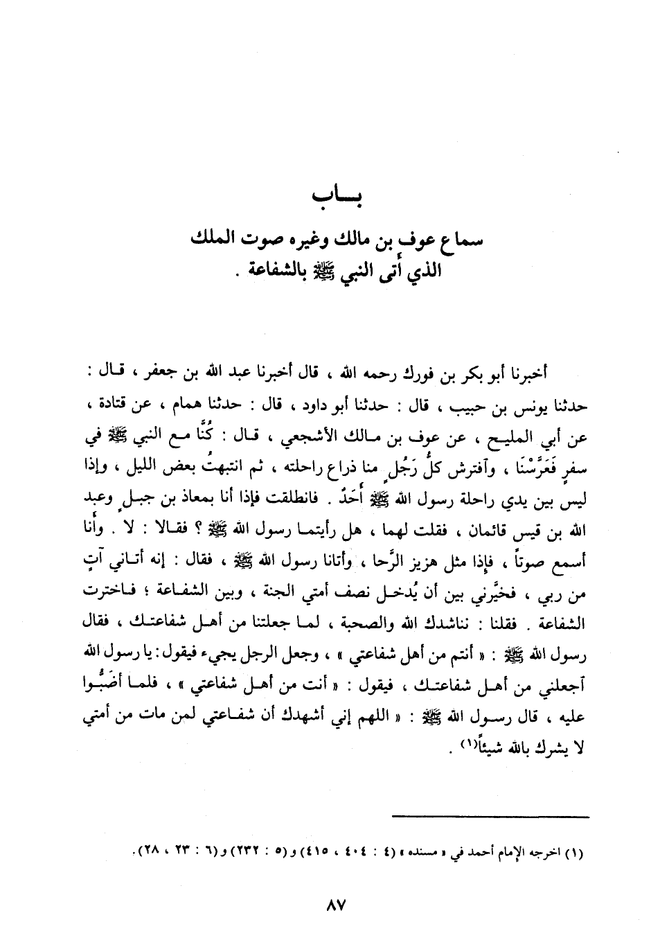 حَدَّثَنَا يُونُسُ بْنُ حَبِيبٍ، قَالَ: حَدَّثَنَا أَبُو دَاوُدَ، قَالَ: حَدَّثَنَا هَمَّامٌ، عَنْ قَتَادَةَ، عَنْ أَبِي الْمَلِيحِ، عَنْ عَوْفِ بْنِ مَالِكٍ الْأَشْجَعِيِّ، قَالَ: كُنَّا مَعَ النَّبِيِّ صَلَّى اللهُ عَلَيْهِ وَسَلَّمَ فِي سَفَرٍ فَعَرَّسْنَا، وَافْتَرَشَ كُلُّ رَجُلٍ مِنَّا ذِرَاعَ رَاحِلَتِهِ، ثُمَّ انْتَبَهْتُ بَعْضَ اللَّيْلِ، وَإِذَا لَيْسَ بَيْنَ يَدَيْ رَاحِلَةِ رَسُولِ اللهِ صَلَّى اللهُ عَلَيْهِ وَسَلَّمَ أَحَدٌ. فَانْطَلَقْتُ فَإِذَا أَنَا بِمُعَاذِ بْنِ جَبَلٍ وَعَبْدُ اللهِ بْنِ قَيْسٍ قَائِمَانِ، فَقُلْتُ لَهُمَا، هَلْ رَأَيْتُمَا رَسُولَ اللهِ صَلَّى الله عليه وَسَلَّمَ؟ فَقَالَا: لَا. وَأَنَا أَسْمَعُ صَوْتًا، فَإِذَا مِثْلُ هَزِيزِ الرَّحَا، وَأَتَانَا رَسُولُ الله صلى الله عَلَيْهِ وَسَلَّمَ، فَقَالَ: إِنَّهُ أَتَانِي آتٍ مِنْ رَبِّي، فَخَيَّرَنِي بَيْنَ أَنْ يَدْخُلَ نِصْفُ أُمَّتِي الْجَنَّةَ، وَبَيْنَ الشَّفَاعَةِ، فَاخْتَرْتُ الشَّفَاعَةَ. فَقُلْنَا: نُنَاشِدُكَ اللهَ وَالصُّحْبَةَ، لَمَا جَعَلْتَنَا مِنْ أَهْلِ شَفَاعَتِكَ، فَقَالَ رَسُولُ اللهِ صَلَّى الله عَلَيْهِ وَسَلَّمَ: «أَنْتُمْ مِنْ أَهْلِ شَفَاعَتِي» ، وَجَعَلَ الرَّجُلُ يَجِيءُ فَيَقُولُ: يَا رَسُولَ اللهِ اجْعَلْنِي مِنْ أَهْلِ شَفَاعَتِكَ، فَيَقُولُ: «أَنْتَ مِنْ أَهْلِ شَفَاعَتِي» ، فَلَمَّا أَضَبُّوا عَلَيْهِ، قَالَ رَسُولُ اللهِ صَلَّى اللهُ عَلَيْهِ وَسَلَّمَ: «اللهُمَّ إِنِّي أُشْهِدُكَ أَنَّ شَفَاعَتِي لِمَنْ مَاتَ مِنْ أُمَّتِي لَا يُشْرِكُ بِاللهِ شَيْئًا