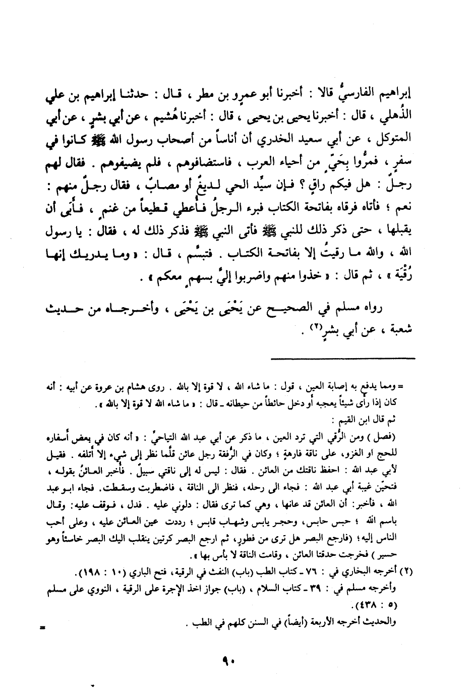 إِبْرَاهِيمَ الْفَارِسِيُّ قَالَا: أَخْبَرَنَا أَبُو عَمْرِو بْنُ مَطَرٍ، قَالَ: حَدَّثَنَا إِبْرَاهِيمُ بْنُ عَلِيٍّ الذُّهْلِيُّ، قَالَ: أَخْبَرَنَا يَحْيَى بْنُ يَحْيَى، قَالَ: أَخْبَرَنَا هُشَيْمٌ، عَنْ أَبِي بِشْرٍ، عَنْ أَبِي الْمُتَوَكِّلِ، عَنْ أَبِي سَعِيدٍ الْخُدْرِيِّ أَنَّ أُنَاسًا مِنْ أَصْحَابِ رَسُولِ اللهِ صَلَّى اللهُ عَلَيْهِ وَسَلَّمَ كَانُوا فِي سَفَرٍ، فَمَرُّوا بِحَيٍّ مِنْ أَحْيَاءِ الْعَرَبِ، فَاسْتَضَافُوهُمْ، فَلَمْ يُضَيِّفُوهُمْ. فَقَالَ لَهُمْ رَجُلٌ: هَلْ فِيكُمْ رَاقٍ؟ فَإِنَّ سَيِّدَ الْحَيِّ لَدِيغٌ أَوْ مُصَابٌ، فَقَالَ رَجُلٌ مِنْهُمْ: