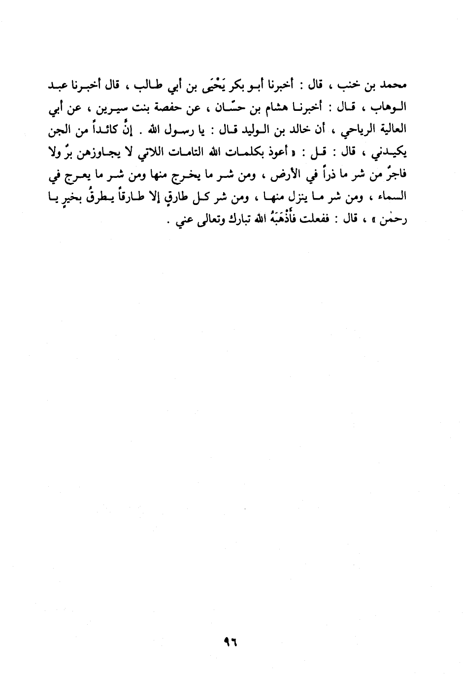 مُحَمَّدُ بْنُ خَنْبٍ، قَالَ: أَخْبَرَنَا أَبُو بَكْرٍ يَحْيَى بْنُ أَبِي طَالِبٍ، قَالَ أَخْبَرَنَا عَبْدُ الْوَهَّابِ، قَالَ: أَخْبَرَنَا هِشَامُ بْنُ حَسَّانَ، عَنْ حَفْصَةَ بِنْتِ سِيرِينَ، عَنْ أَبِي الْعَالِيَةِ الرِّيَاحِيِّ، أَنَّ خَالِدَ بْنَ الْوَلِيدِ قَالَ: يَا رَسُولَ اللهِ. إِنَّ كَائِدًا مِنَ الْجِنِّ يَكِيدُنِي، قَالَ: قُلْ: «أَعُوذُ بِكَلِمَاتِ اللهِ التَّامَّاتِ اللَّاتِي لَا يُجَاوِزُهُنَّ بَرٌّ وَلَا فَاجِرٌ مِنْ شَرِّ مَا ذَرَأَ فِي الْأَرْضِ، وَمَنْ شَرِّ مَا يَخْرُجُ مِنْهَا وَمَنْ شَرِّ مَا يَعْرُجُ فِي السَّمَاءِ، وَمَنْ شَرِّ مَا يَنْزِلُ مِنْهَا، وَمَنْ شَرِّ كُلِّ طَارِقٍ إِلَّا طَارِقًا يَطْرُقُ بِخَيْرٍ يَا رَحْمَنُ» ، قَالَ: فَفَعَلْتُ فَأَذْهَبَهُ اللهُ تَبَارَكَ وَتَعَالَى عَنِّي.