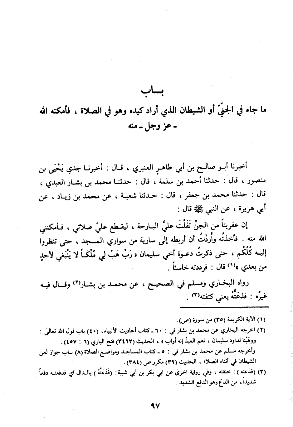 أَخْبَرَنَا أَبُو صَالِحِ بْنُ أَبِي طَاهِرٍ الْعَنْبَرِيُّ، قَالَ: أَخْبَرَنَا جَدِّي يَحْيَى بْنُ مَنْصُورٍ، قَالَ: حَدَّثَنَا أَحْمَدُ بْنُ سَلَمَةَ، قَالَ: حَدَّثَنَا مُحَمَّدُ بْنُ بَشَّارٍ الْعَبْدِيُّ، قَالَ: حَدَّثَنَا مُحَمَّدُ بْنُ جَعْفَرٍ، قَالَ: حَدَّثَنَا شُعْبَةُ، عَنْ مُحَمَّدِ بْنِ زِيَادٍ، عَنْ أَبِي هُرَيْرَةَ، عَنِ النَّبِيِّ صَلَّى اللهُ عَلَيْهِ وَسَلَّمَ قَالَ: إِنَّ عِفْرِيتًا مِنَ الْجِنِّ تَفَلَّتَ عَلَيَّ الْبَارِحَةَ، لِيَقْطَعَ عَلَيَّ صَلَاتِي، فَأَمْكَنَنِي اللهُ مِنْهُ. فَأَخَذْتُهُ وَأَرَدْتُ أَنْ أَرْبُطَهُ إِلَى سَارِيَةٍ مِنْ سَوَارِي الْمَسْجِدِ، حَتَّى تَنْظُرُوا إِلَيْهِ كُلُّكُمْ، حَتَّى ذَكَرْتُ دَعْوَةَ أَخِي سُلَيْمَانَ «رَبِّ اغْفِرْ لِي وَهَبْ لِي مُلْكاً لَا يَنْبَغِي لِأَحَدٍ مِنْ بَعْدِي» [ (1) ] قَالَ: فَرَدَدْتُهُ خَاسِئًا.