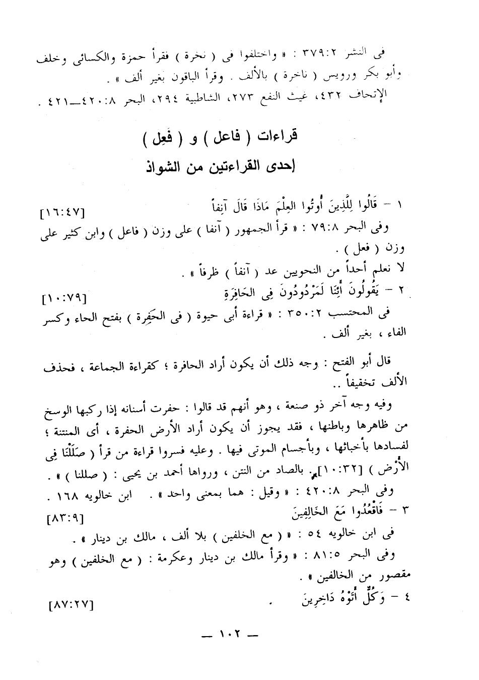 وفي البحر 79:8: «قرأ الجمهور (آنفا) على وزن (فاعل) وابن كثير على وزن (فعل).
