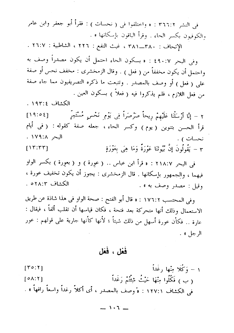 وفي البحر 490:7: «بسكون الحاء احتمل أن يكون مصدرًا وصف به واحتمل أن يكون م خففًا من (فعل). وقال الزمخشري: مخفف نحس أو صفة على (فعل) أو وصف بالمصدر. وتتبعت ما ذكره التصريفيون مما جاء صفة من فعل اللازم، فلم يذكروا فيه (فعلاً) بسكون العين.