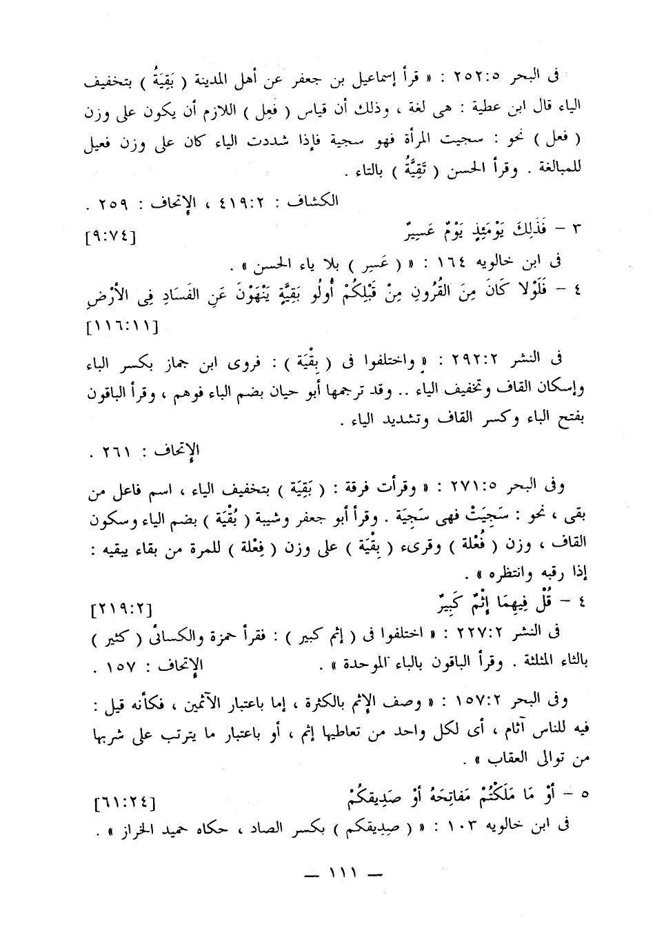 في النشر 292:2: «واختلفوا في (بقية): فروى ابن جماز بكسر الباء وإسكان القاف وتخفيف الياء .. وقد ترجمها أبو حيان بضم الباء فوهم، وقرأ الباقون بفتح الباء وكسر القاف وتشديد الياء.