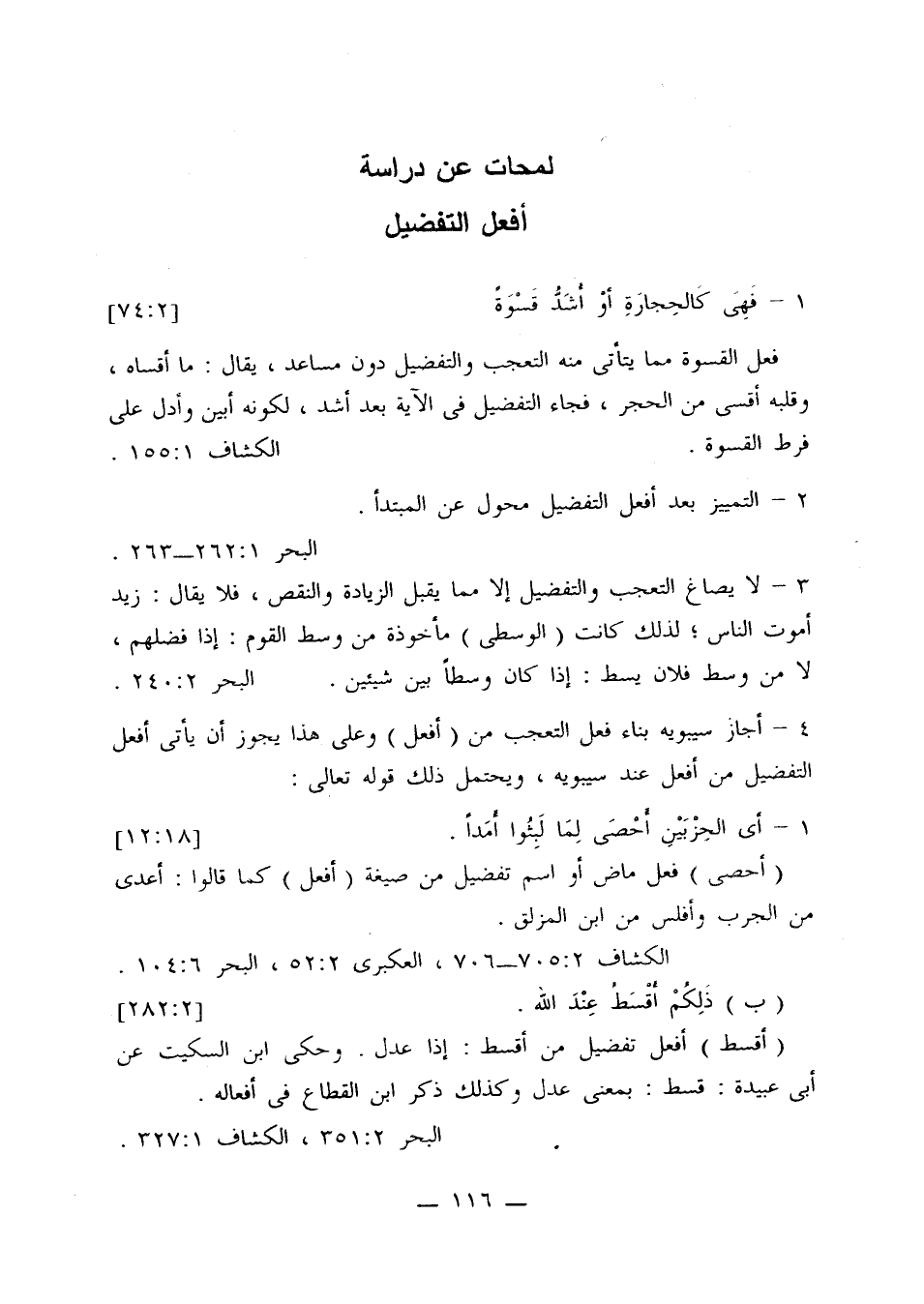 3 - لا يصاغ التعجب والتفضيل إلا مما يقبل الزيادة والنقص، فلا يقال: زيد أموت الناس؛ لذلك كانت (الوسطى) مأخوذة من وسط القوم: إذا فضلهم: لا من وسط فلان يسط: إذا كان وسطأ بين شيئين. البحر 240:2.