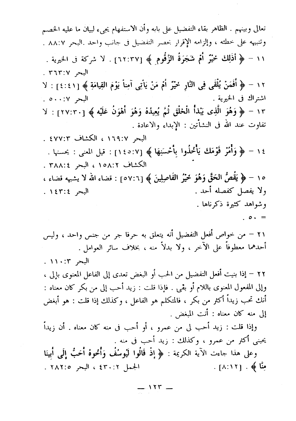 11 - أَذَلِكَ خَيْرٌ نُزُلا أَمْ شَجَرَةُ الزَّقُّومِ {62:37]. لا شركة في الخيرية. البحر 363:7.