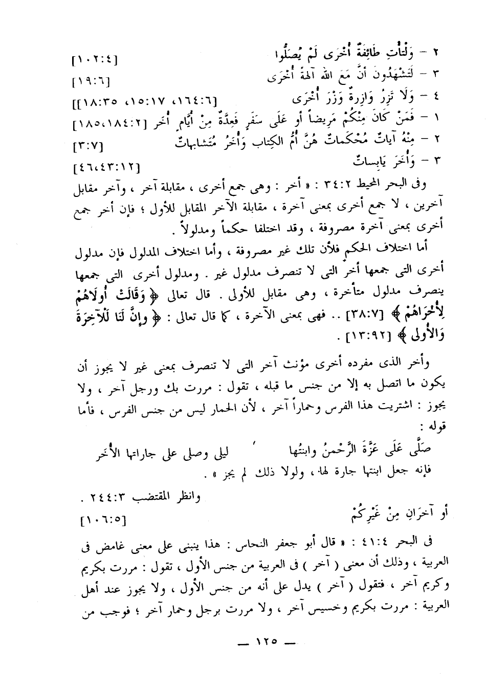 وفي البحر المحيط 34:2: «أخر: وهي جمع أخرى، مقابلة آخر، وآخر مقابل آخرين، لا جمع أخرى بمعنى آخرة، مقابلة الآخر المقابل للأول؛ فإن أخر جمع أخرى بمعنى آخرة مصروفة، وقد اختلفا حكمًا ومدلولاً.