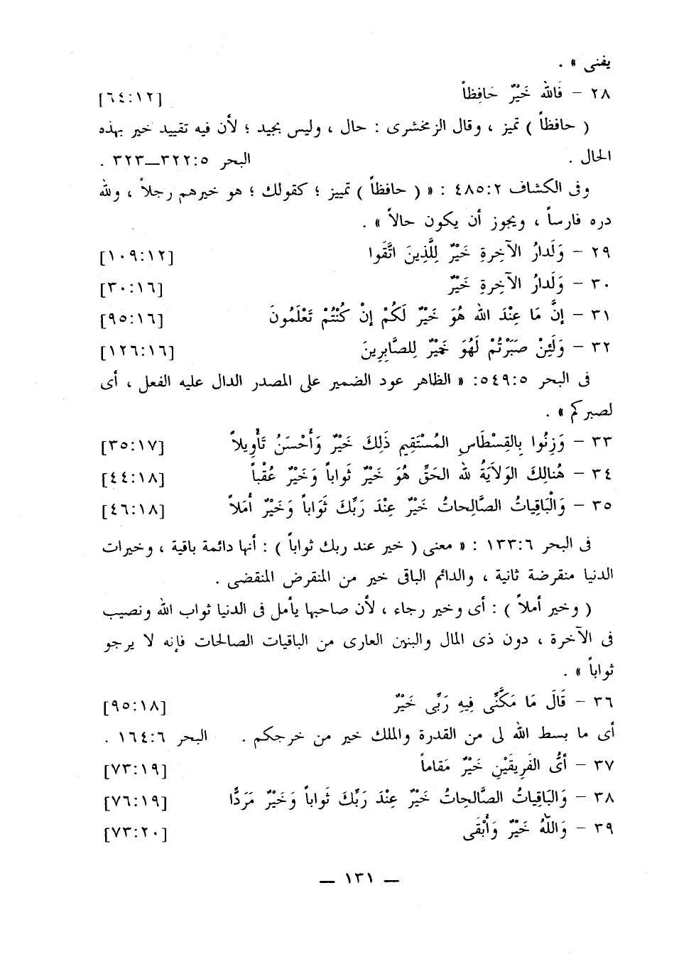 في البحر 133:6: «معنى (خَيْرٌ عِنْدَ رَبِّكَ ثَوَابًا): أنها دائمة باقية، وخيرات الدنيا منقرضة ثانية، والدائم الباقي خير من المنقرض المنقضي.