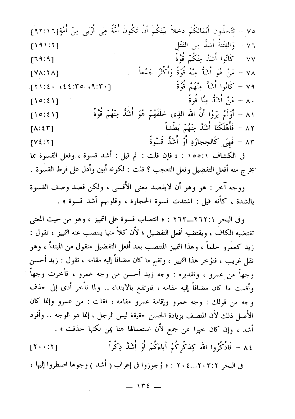 وفي البحر 262:1 - 263: «انتصاب قسوة على التمييز، وهو من حيث المعنى تقتضيه الكاف، ويقتضيه أفعل التفضيل؛ لأن كلاً منها ينتصب عنه التمييز، تقول: زيد كعمرو حلمًا، وهذا التمييز المنتصب بعد أفعل التفضيل منقول من المبتدأ، وهو نقل غريب، فتؤخر هذا التمييز، وتقيم ما كان مضافًا إليه مقامه، تقول: زيد أحسن وجهًا من عمرو، وتقديره: وجه زيد أحسن من وجه عمرو، فأخرت وجهًا وأقمت ما كان مضافًا إليه مقامه، فارتفع بالابتداء .. ولما تأخر أدى إلى حذف وجه من قولك: وجه عمرو وإقامة عمرو مقامه، فقلت: من عمرو وإنما كان الأصل ذلك لأن المتصف بزيادة الحسن حقيقة ليس الرجل، إنما هو الوجه .. وأفرد أشد، وإن كان خيرًا عن جمع لأن استعمالها هنا يمن لكنها حذفت».