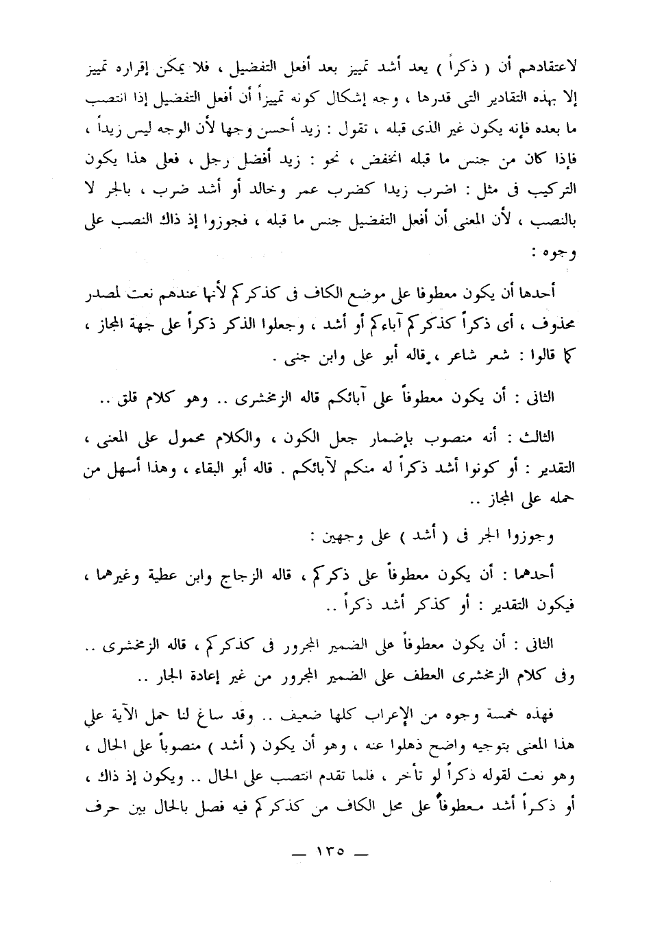 فهذه خمسة وجوه من الإعراب كلها ضعيف .. وقد ساغ لنا حمل الآية على هذاع المعنى بتوجيه واضح ذهلوا عنه، وهو أن يكون (أشد) منصوبًا على الحال، وهو نعت لقوله ذكرًا لو تأخر، فلما تقدم انتصب على الحال .. ويكون إذ ذاك، أو ذكرًا أشد معطوفًا على محل الكاف من كذكركم فيه فصل بالحال بين حرف