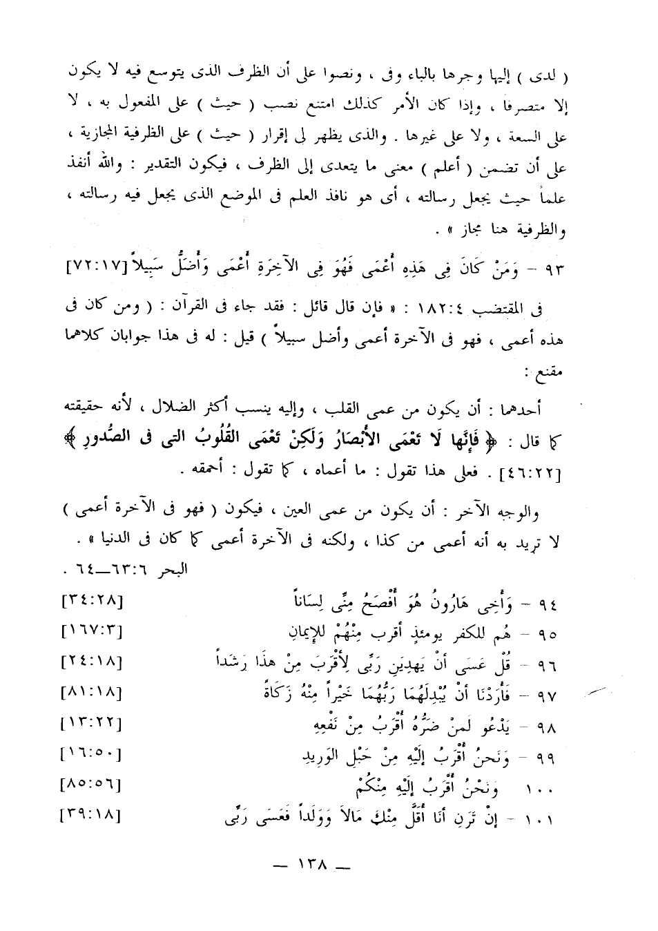 في المقتضب 182:4: «فإن قال قائل: فقد جاء في القرآن: (ومن كان في هذه أعمى، فهو في الآخرة أعمى وأضل سبيلاً) قيل: له في هذا جوابان كلاهما مقنع: