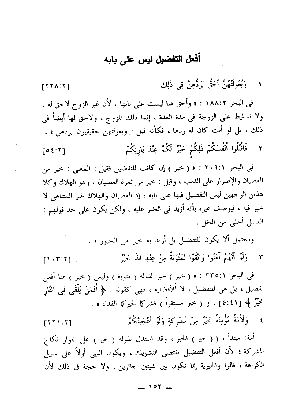 في البحر 209:1: «(خير) إن كانت للتفضيل فقيل: المعنى: خير من العصيان والإصرار على الذنب، وقيل: خير من ثمرة العصيان، وهو الهلاك وكلا هذين الجهين ليس التفضيل فيها على بابه؛ إذ العصيان والهلاك غير التناهي لا خير فيه، فيوصف غيره بأنه أزيد في الخير عليه، ولكن يكون على حد قولهم: العسل أحلى من الخل