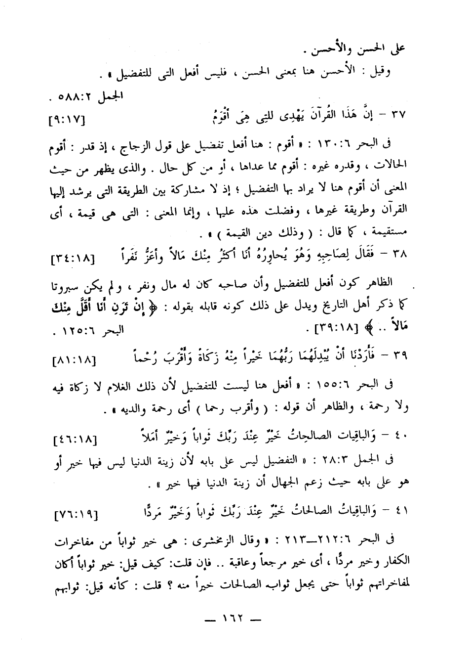في البحر 130:6: «أقوم: هنا أفعل تفضيل على قول الزجاج، إذ قدر: أقوم الحالات، وقدره غيره: أقوم مما عداها، أو من كل حال. والذي يظهر من حيث المعنى أن أقوم هنا لا يراد بها التفضيل؛ إذ لا مشاركة بين الطريقة التي يرشد إليها القرآن وطريقة غيرها، وفضلت هذه عليها، وإنما المعنى: التي هي قيمة، أي مستقيمة، كما قال: (وذلك ديق القيمة)».