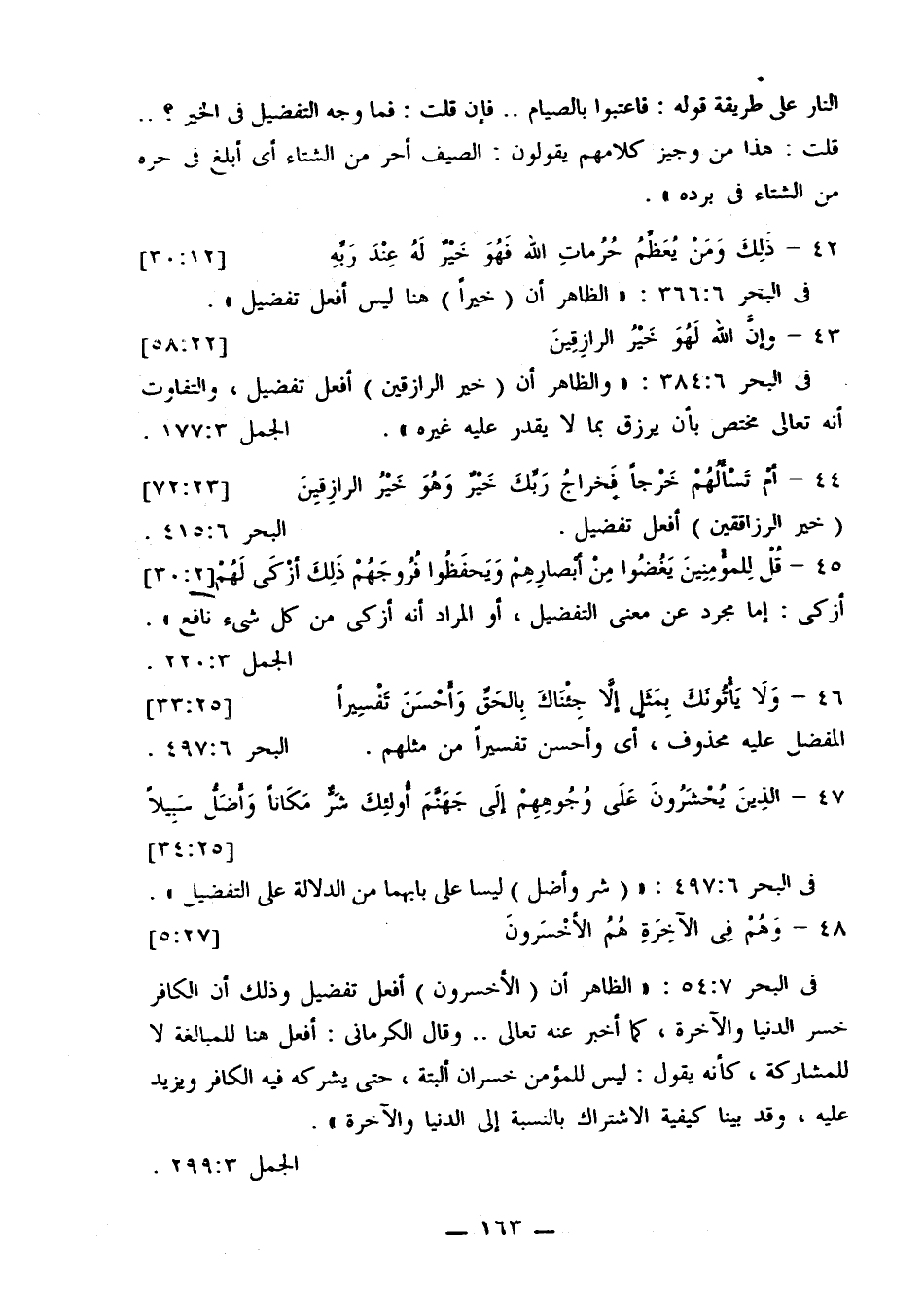 في البحر 54:7: «الظاهر أن (الأخسرون) أفعل تفضيل وذلك أن الكافر خسر الدنيا والآخرة، كما أخبر عنه تعالى .. وقال الكرماني: أفعل هنا للمبالغة لا للمشاركة، كأنه يقول: ليس للمؤمن خسران البتة، حتى يشركه فيه الكافر ويزيد عليه، وقد بينا كيفية الاشتراك بالنسبة إلى الدنيا والآخرة».