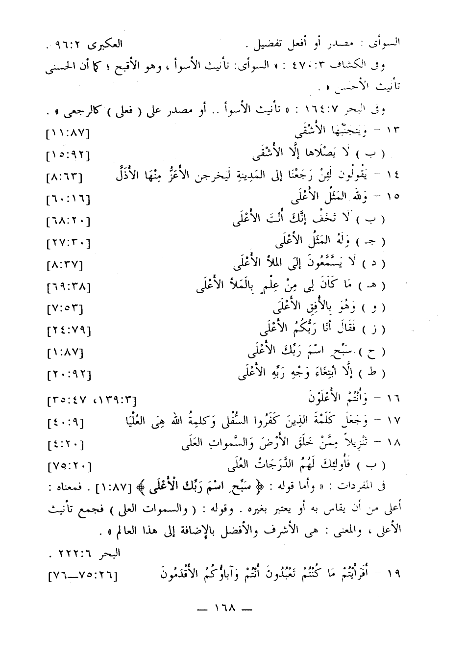 في المفردات: «وأما قوله: سَبِّحِ اسْمَ رَبِّكَ الأَعْلَى {1:87]. فمعناه: أعلى من أن يقاس به أو يعتبر بغيره. وقوله: (والسموات العلى) فجمع تأنيث الأعلى، والمعنى: هي الشرف والأفضل بالإضافة إلى هذا العالم».