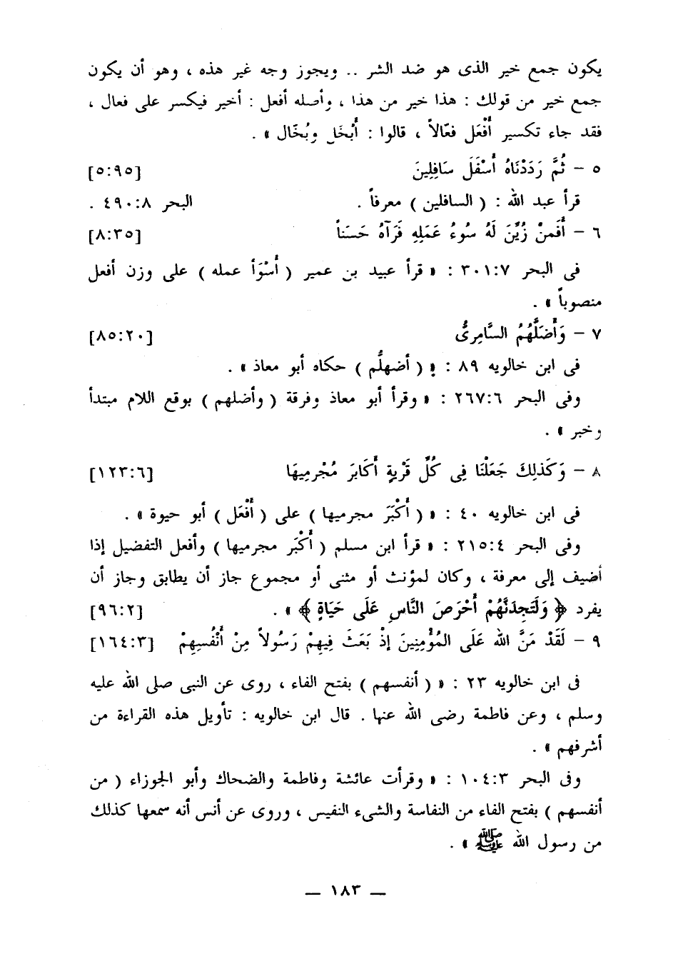 وفي البحر 215:4: «قرأ ابن مسلم (أكبر مجرميها) وأفعل التفصيل إذا أضيف إلى معرفة، وكن لمؤنث أو مثنى أو مجموع جاز أن يطابق وجاز، يفرد {وَلَتَجِدَنَّهُمْ أَحْرَصَ النَّاسِ عَلَى حَيَاةٍ} [96:2}
