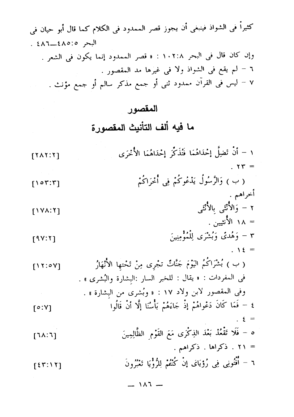 كثيرًا في الشواذ فينبغي أن يجوز قصر الممدود في الكلام كما قال أبو حيان في البحر 485:5 - 486.